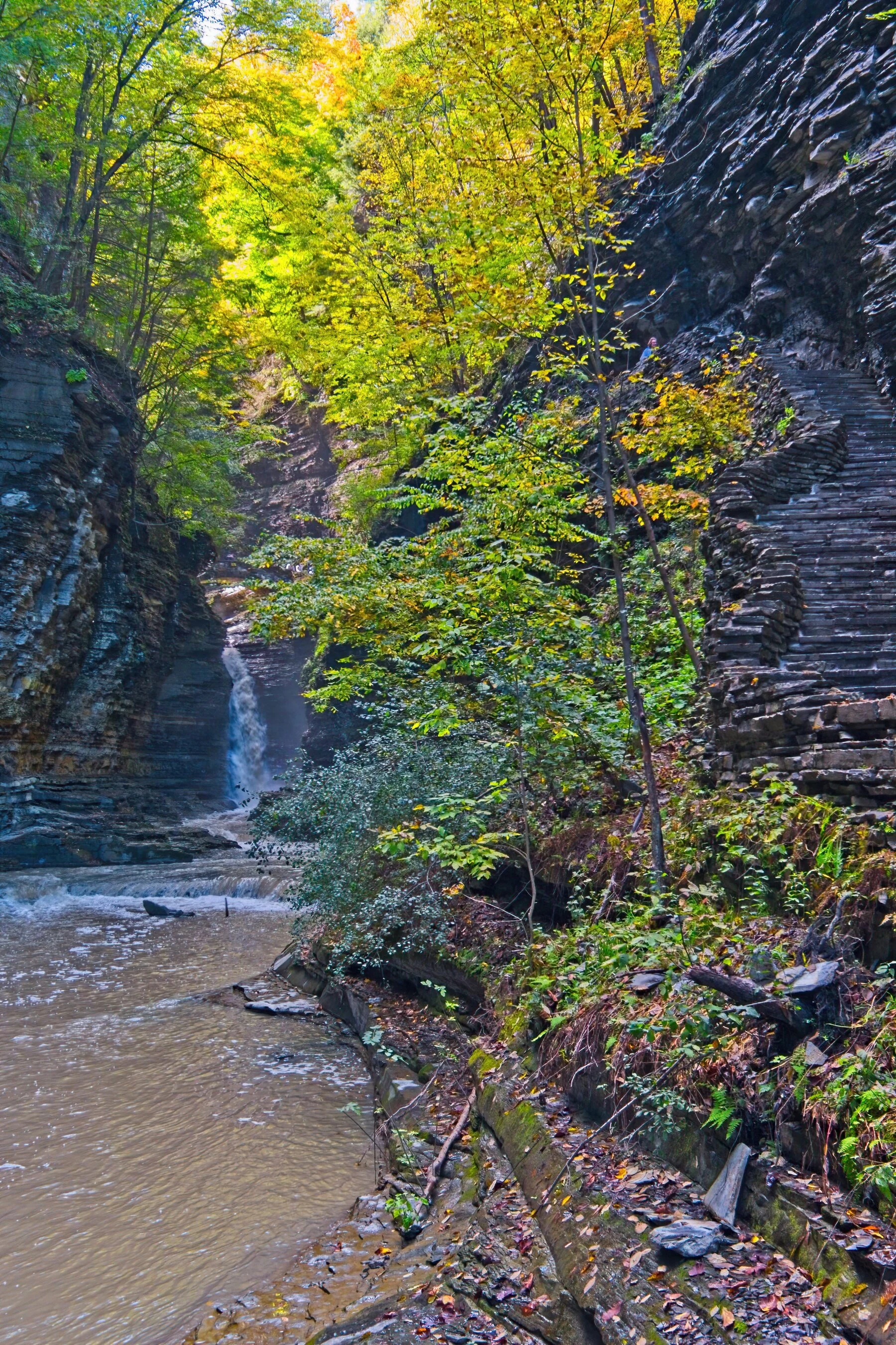 Once again we are in the Glen at Watkins Glen, NY. If you look carefully you will see stone steps leading up from the creek level - this is the trail you follow - and on the left edge of most of the steps you can see the rainwater coursing down the stairs.