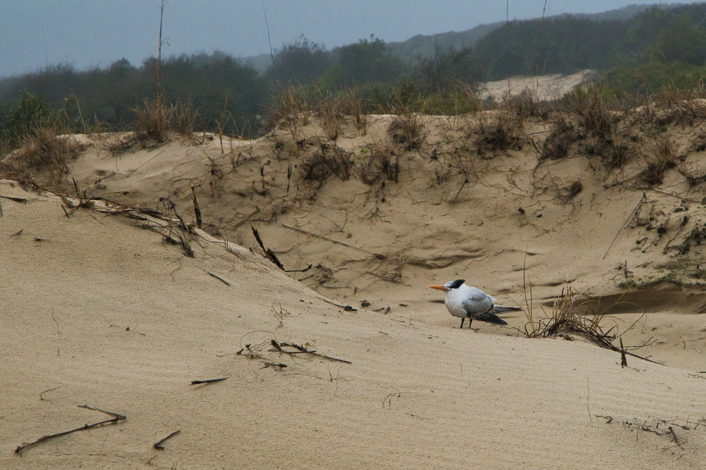 Well it did not feel like it. It was raining hard now and the wind was much sharper on the shore than inland even a quarter of a mile. We walked the boardwalk over the dunes but chose to turn back when this Royal Tern landed a few feet away and sort of said, I’m done too. We walked back toward the shelter of a bathhouse and the high tree canopy right past this tired bird who did not move.