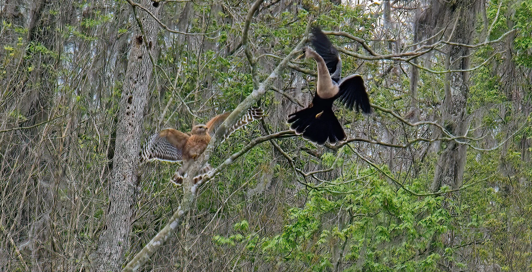 The Coopers Hawk landed on this tree about 20 feet lower and then the Ahinga started hissing at it but when the hawk flew up the Ahinga squawked and fussed but still took off leaving most of a fish behind. The hawk then settled in to finish the seafood dinner. All this happened at Silver Springs State Park while I was in a kayak tying to keep things still for the photo. Only partially succeeded. Was neat to see.