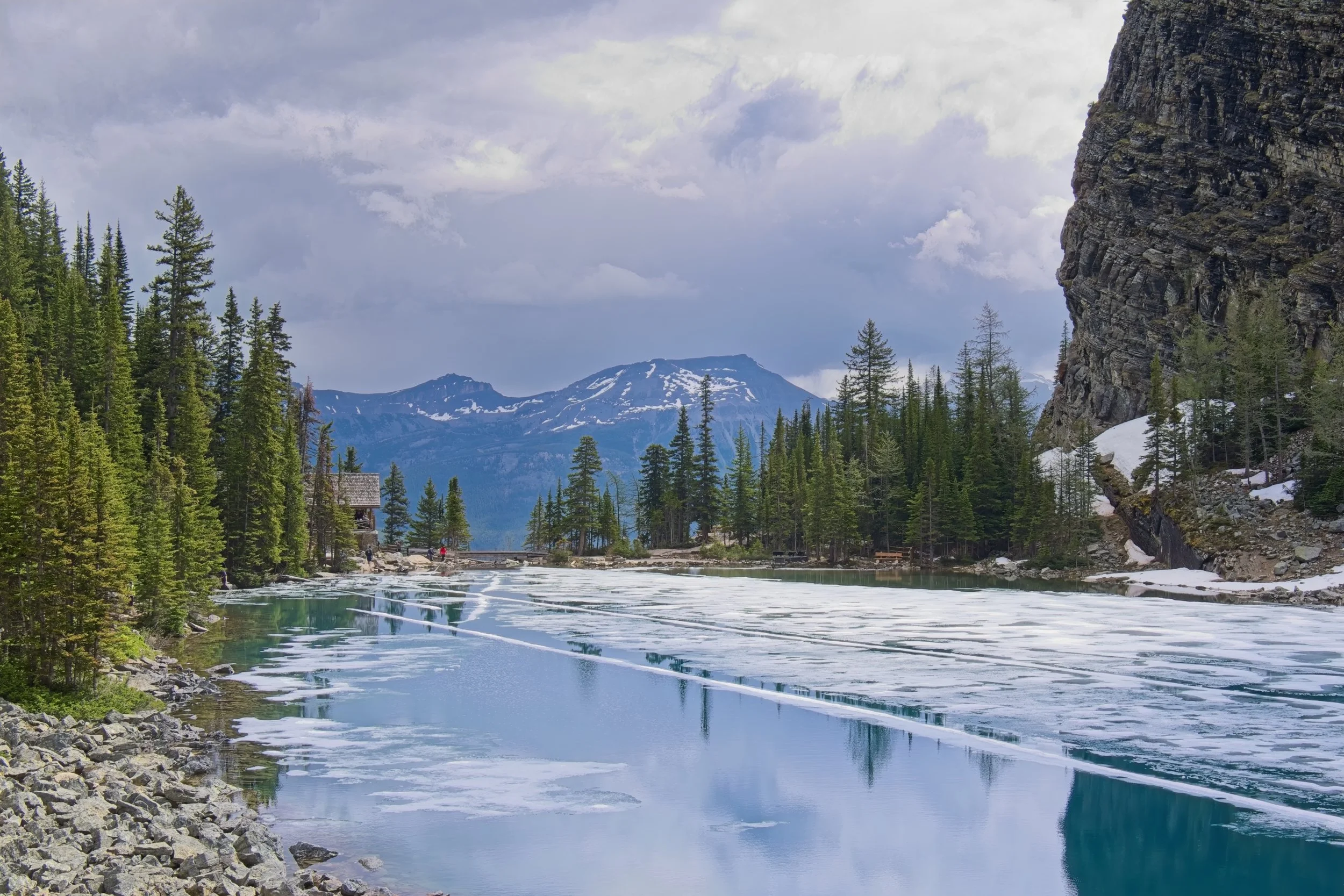 Banff has amazing scenery and it is almost overwhelming with the vistas, the lakes and mountains that seem endless. Yet, one of the best things I have done there is the hike to Lake Agnes and the Lake Agnes Tea House. Rebuiit in 1981 it serves coffee, tea and pastries during the season. You can only get here by foot and everything in the tea house is carried up the mountain as well. The walk around the lake lead me to the view in this photo looking back toward the tea house on the extreme left of the photo. Note the lake is still full of ice even on the mid-June afternoon.