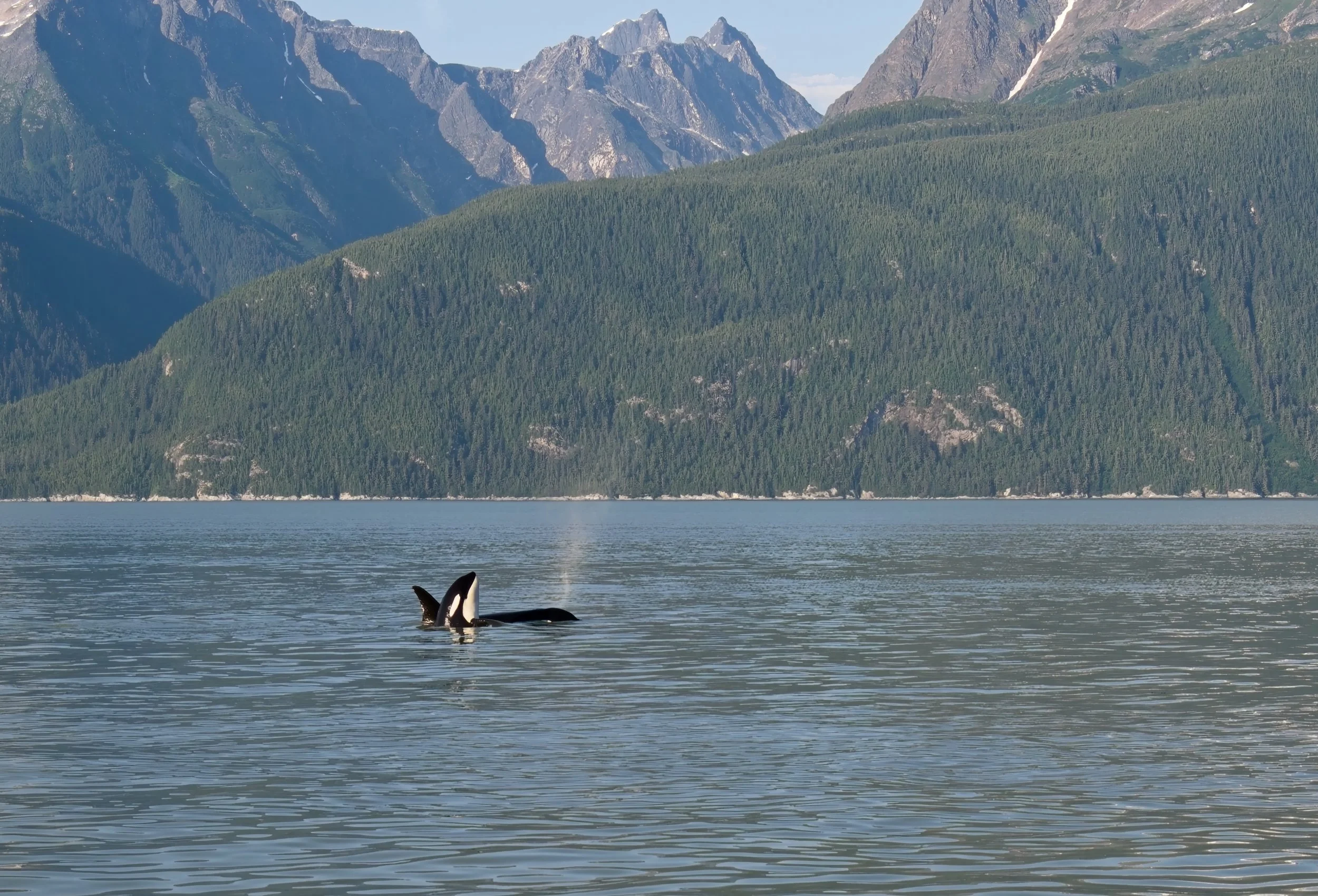 Orcas. We were traveling back from Juneau to Haines by ferry late in the evening. thanks to the long days we could still see a bit even though it was well past ten. As we traveled we saw a pod of Orcas, five I think. And they stayed abreast of us for more than 30 minutes or in photo-speak, 200 shots. These were not the only Orcas we saw in Alaska but by far the best and longest viewing time. What a treat.