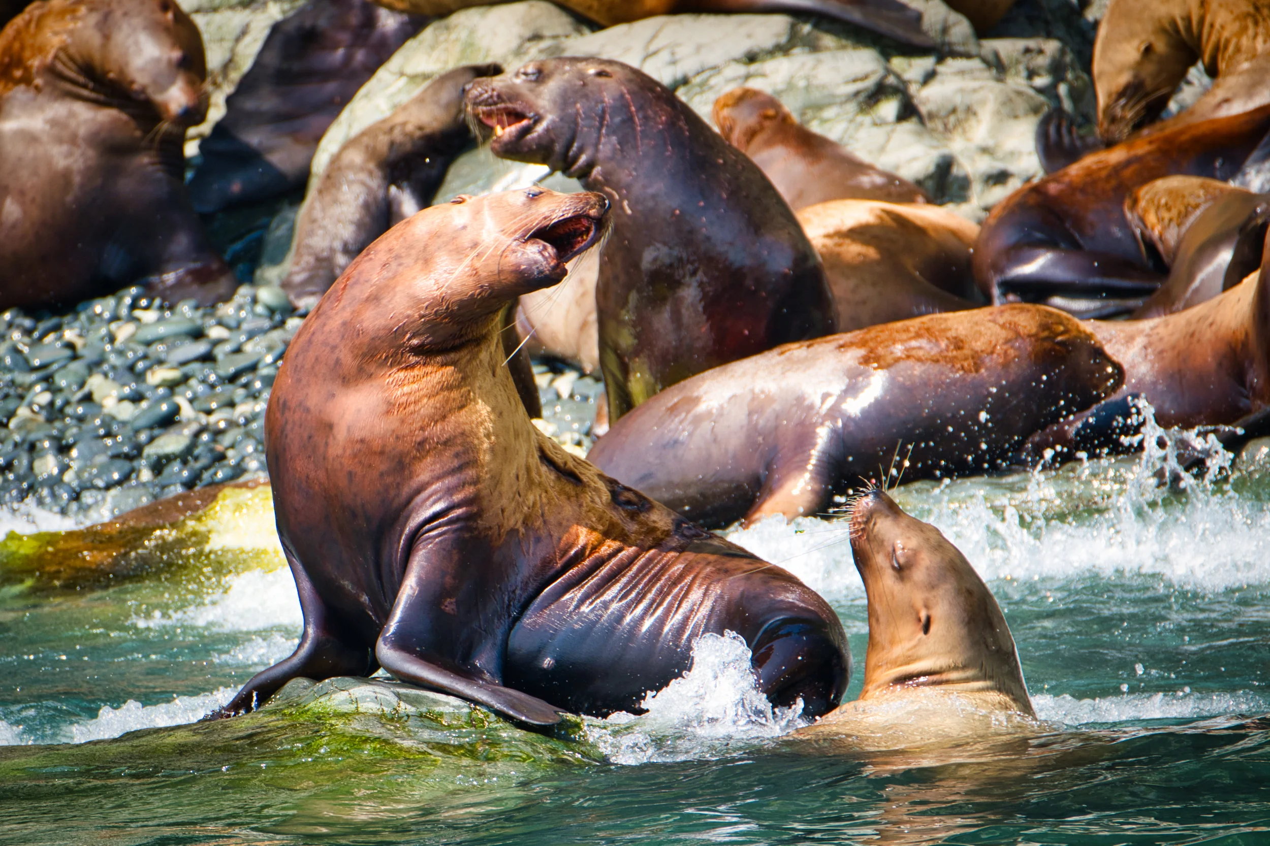 Back to the Lulu Bell for a tour boarding at 10:30. We travel a long distance on this beautiful boat ending at the Columbia Glacier miles from port. The Captain has been doing this for four decades. Everyday all summer and he talks nearly the entire time with entertaining descriptions and history and gentle humor. The boat is full of teak wood, nice seats, galley with reasonably priced food and nice viewing all the way around and up to the second deck and the flying bridge. There were about 40 people on board so it was not crowded at all. We first encountered a raft of about 20 otters and spent a bit of time there, then we sailed about 30 minutes to watch a commercial fishing boat and crew complete a catch with a narrative by our captain as to how it works. Interesting. Then we passed brownies over to the crew of the fishing boat via a long handled net. Soon we were along shore with scores of sea lions. Noisy group. And then we nosed into some sea caves to see puffins. He put the front of the boat into the cave and it was tight. Super neat. We actually did two caves. The puffin were hard to photograph, dark spaces, small twitchy birds and a rocking boat. Moving along we spotted two mountain goats, mom and her baby on a cliff and he idled us right up to the edge. We also saw dolphin and dozens more otters lounging on ice bergs. About 3 hours in and we round the bend to see Columbia Glacier. We are still five miles out and it is huge. Ice bergs large and small dot the sea. We approach the ice wall and sit less than 1/4 mile from the 200 - 300 foot ice cliff that stretches across the bay. He says we will sit for an hour so we get a good event. Well the event occurred in less than 20 minutes and it was huge, according to the captain the largest he ever saw in 41 years of leading tours. It lasted several minutes and a massive wave ensued. The boat was up and down and the bay so filled with ice that the Lulu Bell had to push the ice away with the prow of the boat. People were visibly nervous when the large berg turned over and the spray rose high in the air. We did not see too much on the return and no whale, the only minor flaw in a nearly perfect day.