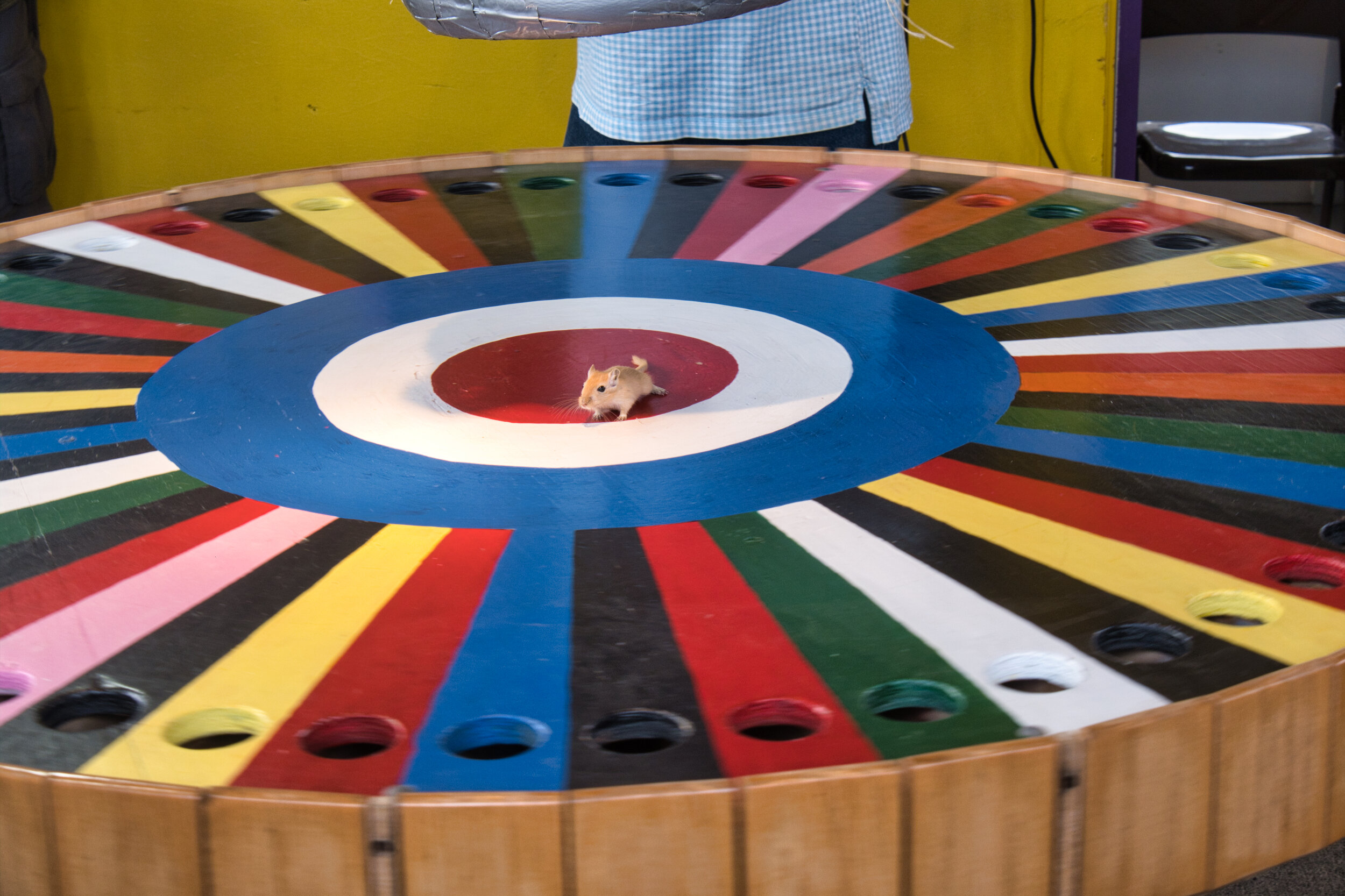 Alaska has a fair share of the unusual. At the State Fair we saw The Rat Race and that certainly fits in the “really” category. A gerbil is released from a small space in the middle of this wheel. It stares for a minute or two at the crowd and then darts for a hole. If your 25 cent bet is on the color that corresponds with the hole you can win up to a dollar. The Alaska legislature had to pass special rules to allow this long tradition to continue at the fair. I lost 50 cents - I think the gerbil did not like pink.