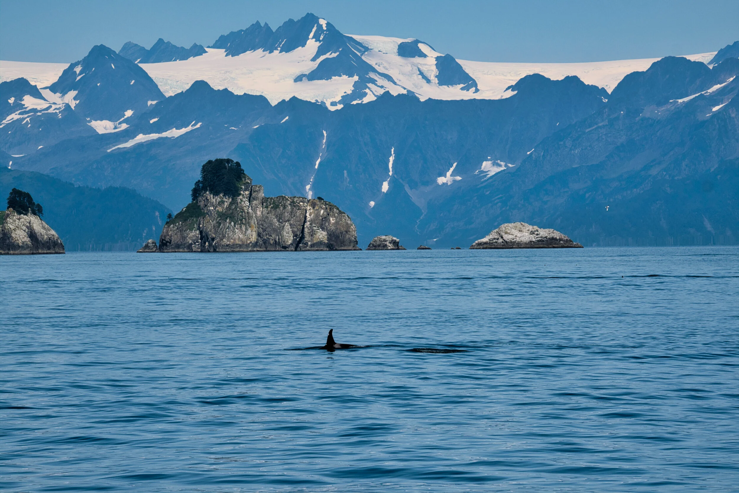 Watching off the side of the ferry at the passing scenery, a killer whale rises up in the sound. We were in Kenai Fjords National Park on the Alalik Bay.