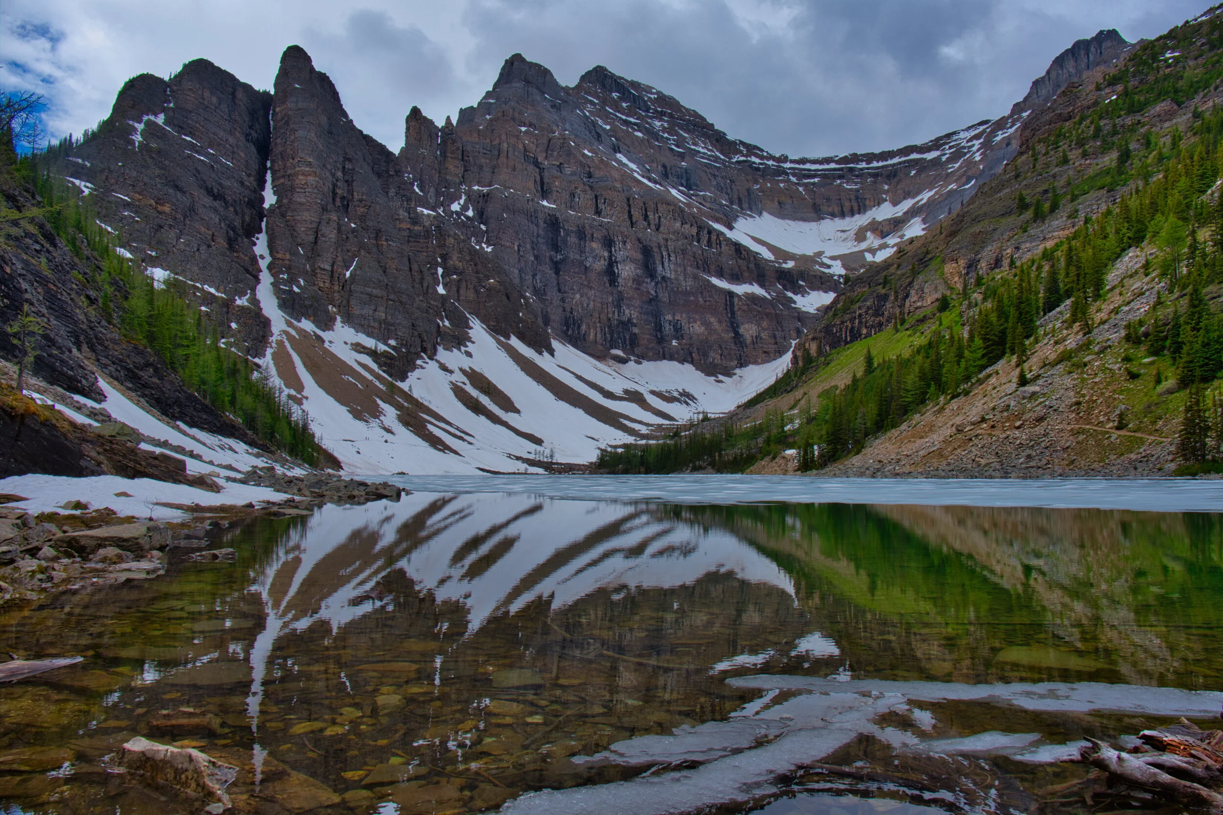 Above Lake Louise and the fabulous hotels and gorgeous waters of Lake Louise is a trail that ends at Lake Agnes about 2 3/4 miles one way and worth every step. Half the lake is still ice covered in this photo and half open with a reflection of the mountains and sky.