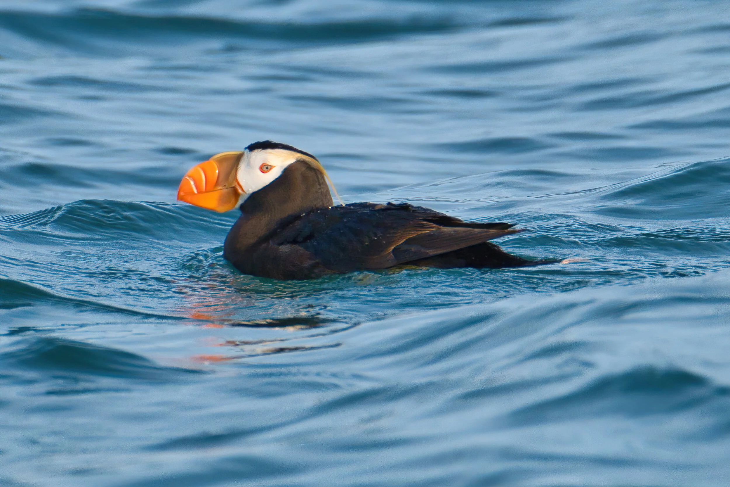 Our first candidate for Head Bird for the season is a newly edited and previously unpublished Tufted Puffin (though another one of the puffin has been seen before). This little bird prefers the cold waters of the northern Pacific and was captured in Alaska’s Kachemak Bay south of Homer. I imagine you know that a group of crows is a “murder,” hawks, a kettle, eagles a congregation and doves a cote. So do you know what four puffins are called? KISS:)
