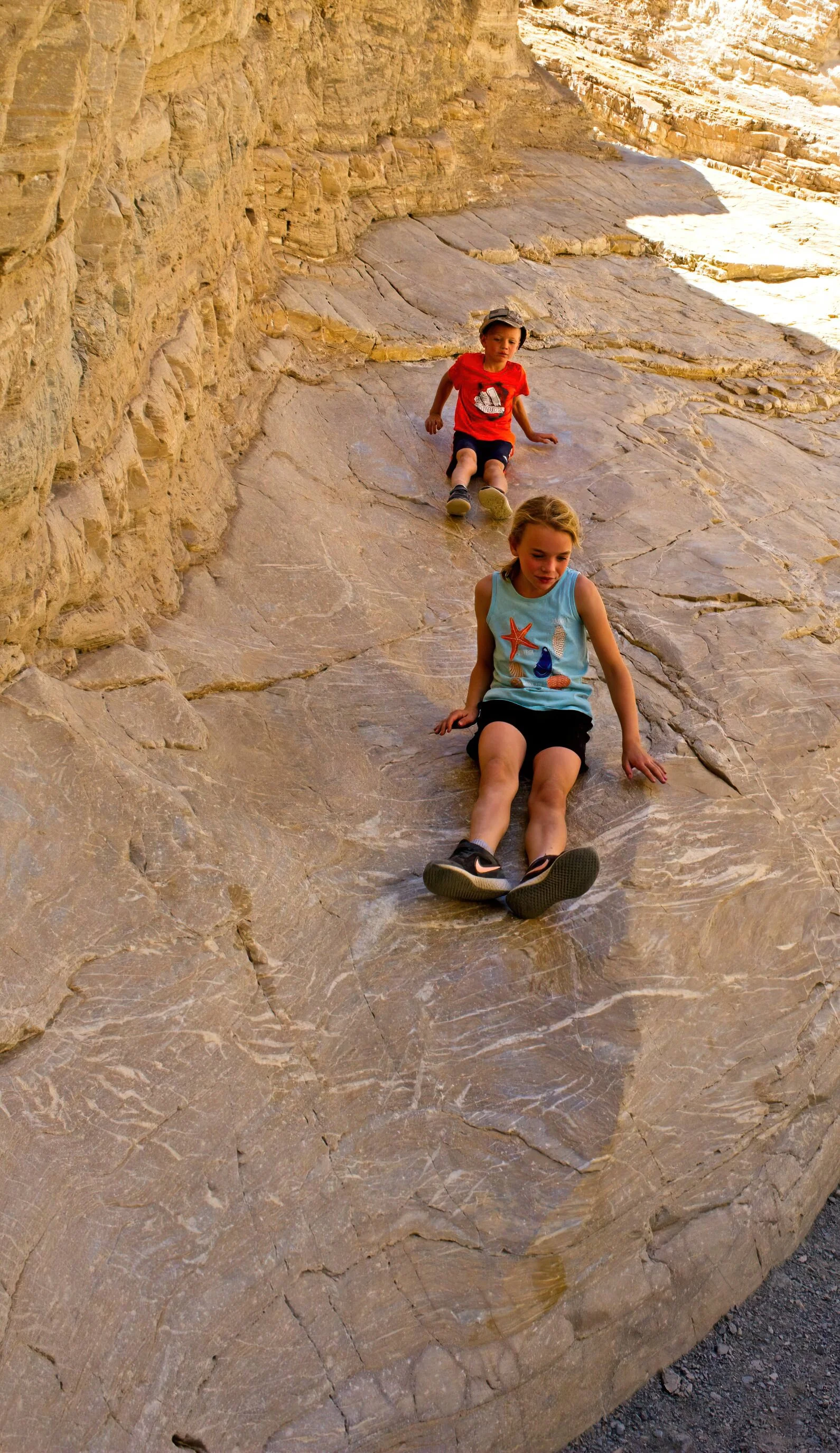 These two kids found a natural slide in the Mosaic Canyon in Death Valley. They were having a lot of fun on the rock that had been worn smooth over years of wind and floods in the canyon.