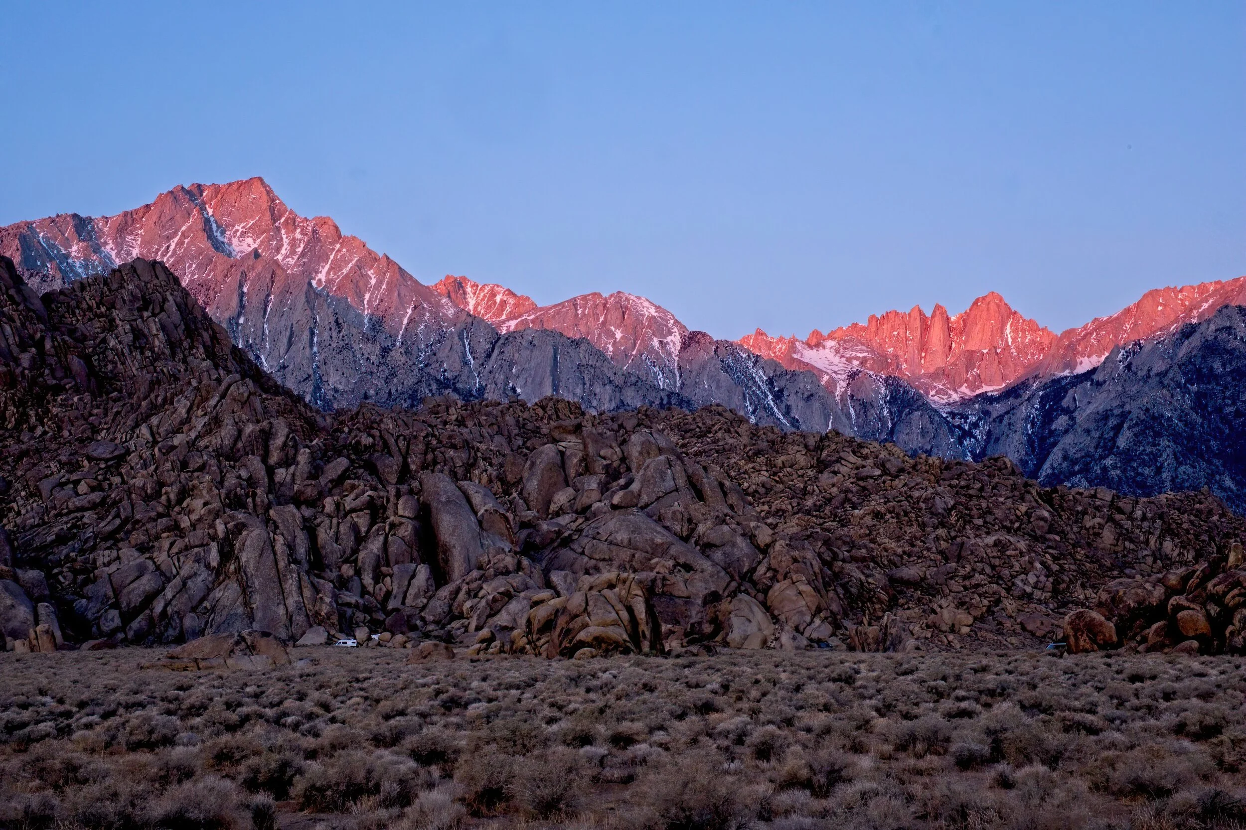 The sun just beginning to light up the eastern range of the Sierra Nevadas as seen from the Alabama Hills.