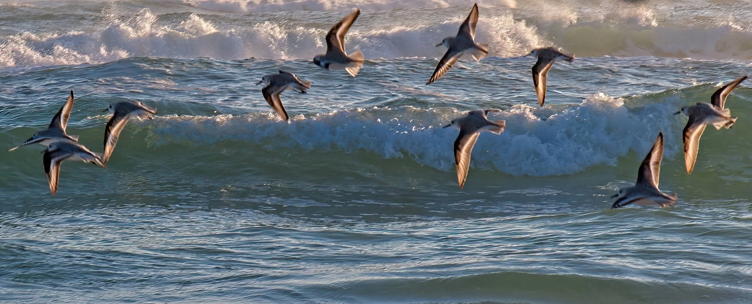 Flock of sandpipers at Chincoteague National Wildlife Refuge. They are skittish birds and when one decides it is time to leave they erupt off the sand in an instant.