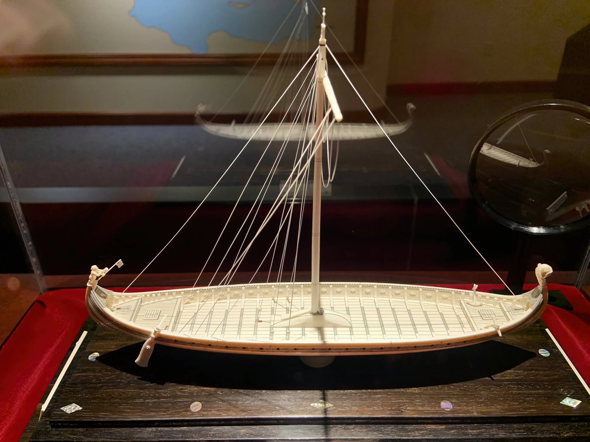 After we eased south into Ohio Amish land. We are staying for the night in the parking lot of David Warther, Carver. This place is extraordinary. He has carved 90 perfectly scaled, accurate and historically important boats from Egypt to the early 20th century. His medium is ivory, including the rigging which he invented a way to make when he was in high school. You get a tour of the perfectly displayed boats, a visit from David and you can see into his windowed workshop. Words fail to convey these works of art. And the photos will not compare to the dazzling jeweled perfection of these miniatures either. Wow.
