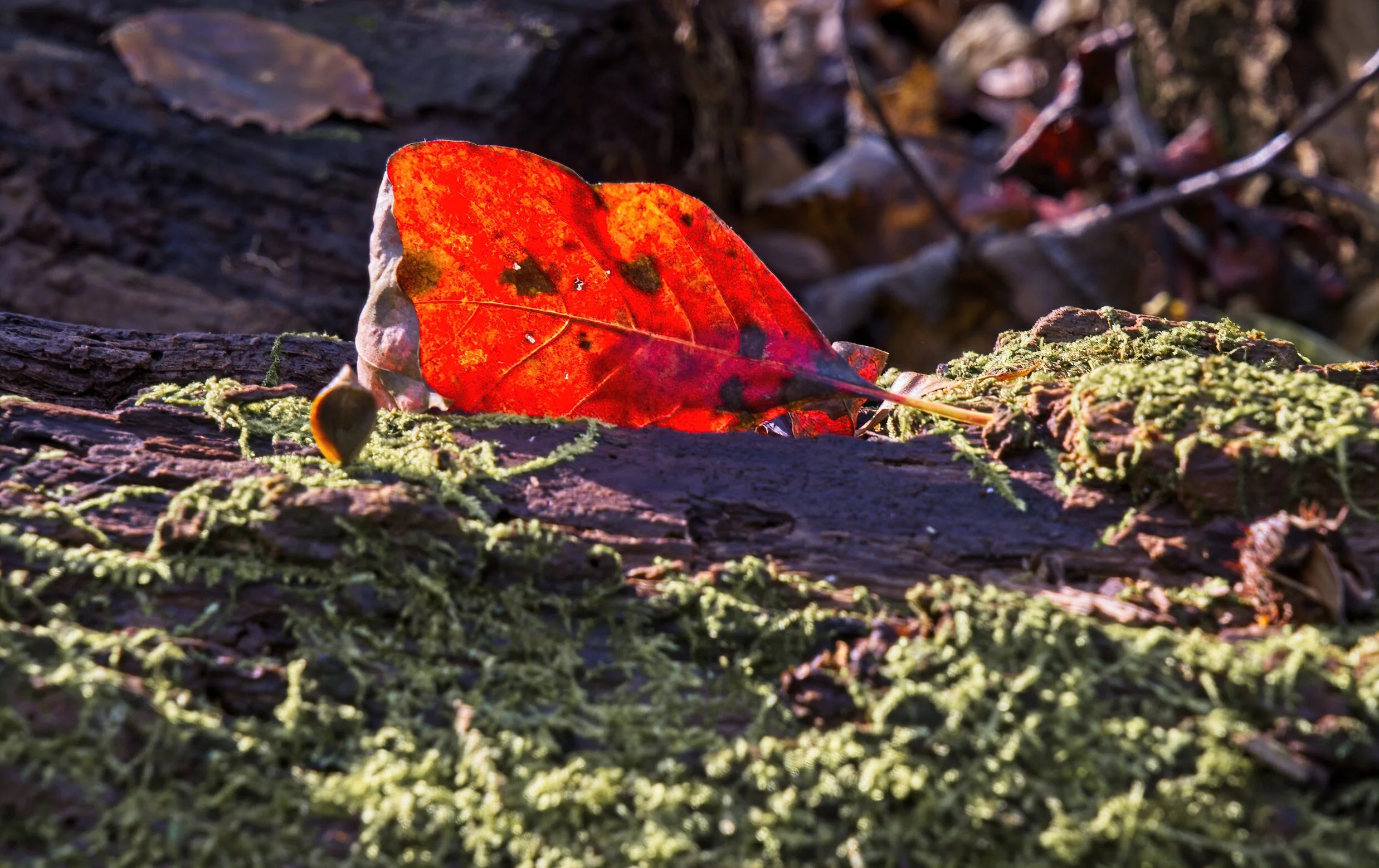 A single red leaf as we walked a trail in the forest. The sun came from behind a cloud, it illuminated and I dropped down to shoot a shot, then as I changed to a better f stop the light went in, a gust blew the leaf and that was done. Photography is often a single fleeting moment.