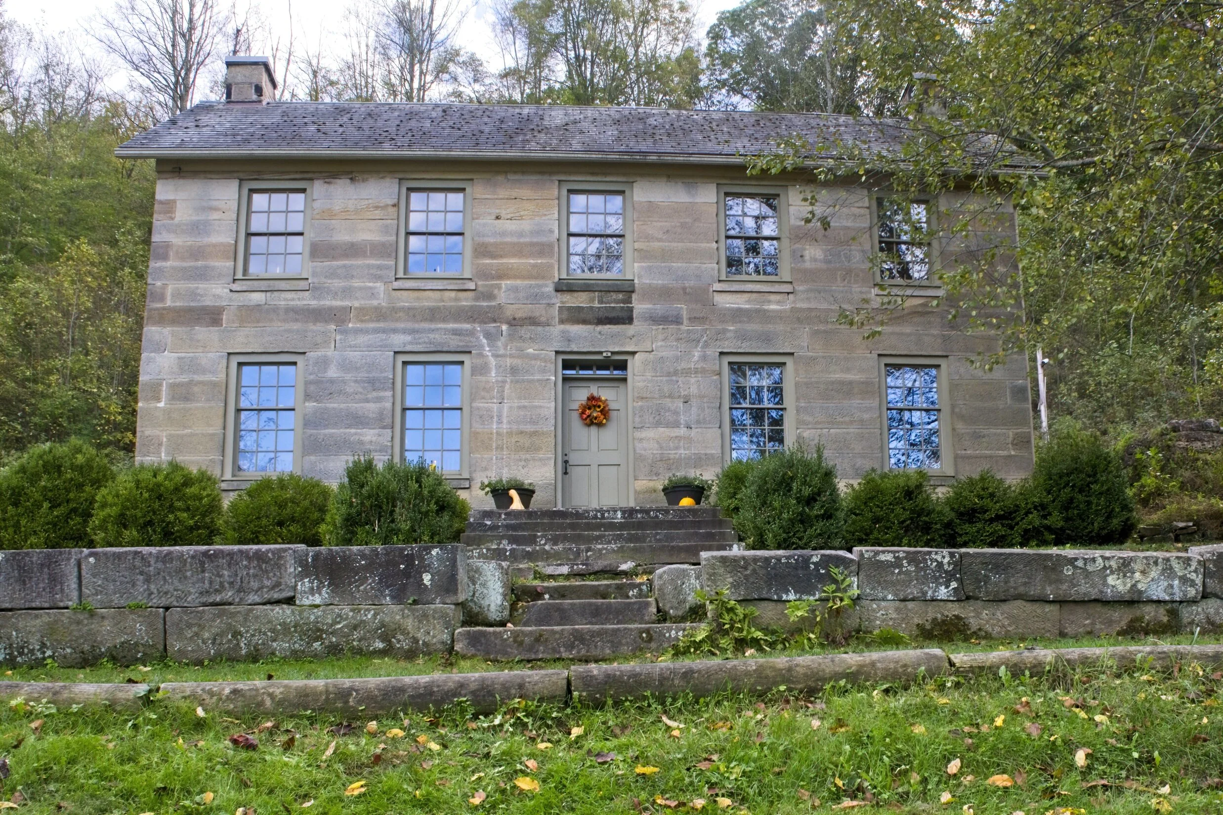 It was 1968 and I had a brand new Austin Healy Sprite (BRG of course) and a pretty girl I was dating (still am) so we were off driving around Western Pennsylvania for the day. We visited Fort Necessity briefly and then went to Point Marion where Cindy’s dad was the minster and she started kindergarten. On the way out of town we came to a PA historical marker along the highway about Friendship Hill the home of Albert Gallitan. I did not know him but the driveway was enticing. So down the long tree lined drive we went top down on the car. It was still a private home - the park service bought it in 1979. As we paused near the house two huge dogs came running out barking at us. They were Irish Wolf hounds and much taller than the car. Their heads reached easily over the sill. Then a lady appeared, just laughed and said they were harmless. We said we were just exploring a bit and she waved us on our way after calling the dogs back to the house. Today’s visit was more sedate. The house is a rambling miso-mash of additions yet very interesting. The grounds were beautiful fields and woods on a bluff overlooking the Monongahela River.