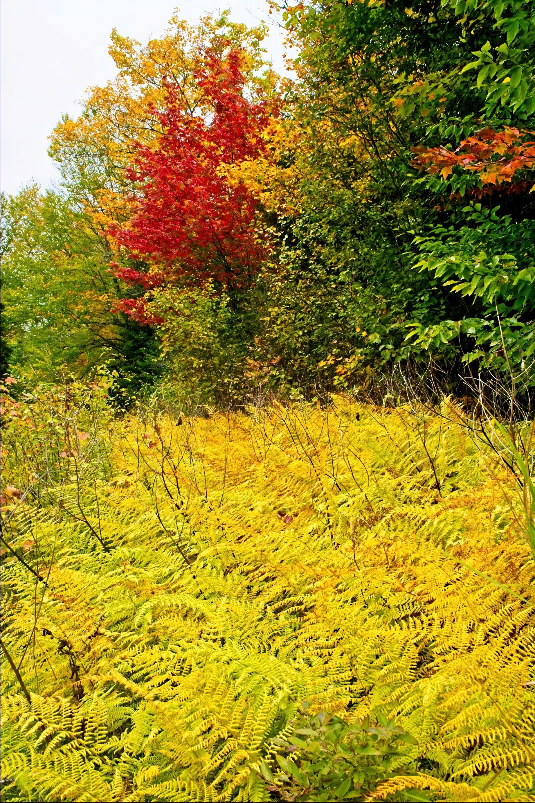 Driving in northern New Hampshire I was looking for some of the ferns that were not green or dead but the rich gold they turn briefly. Most fields were brown or some brown and a scattering of gold. Then I spied this tiny patch along the road with the bonus trees in the background. There were light poles and wires and road and some signs so the focus was a narrow slice of countryside.