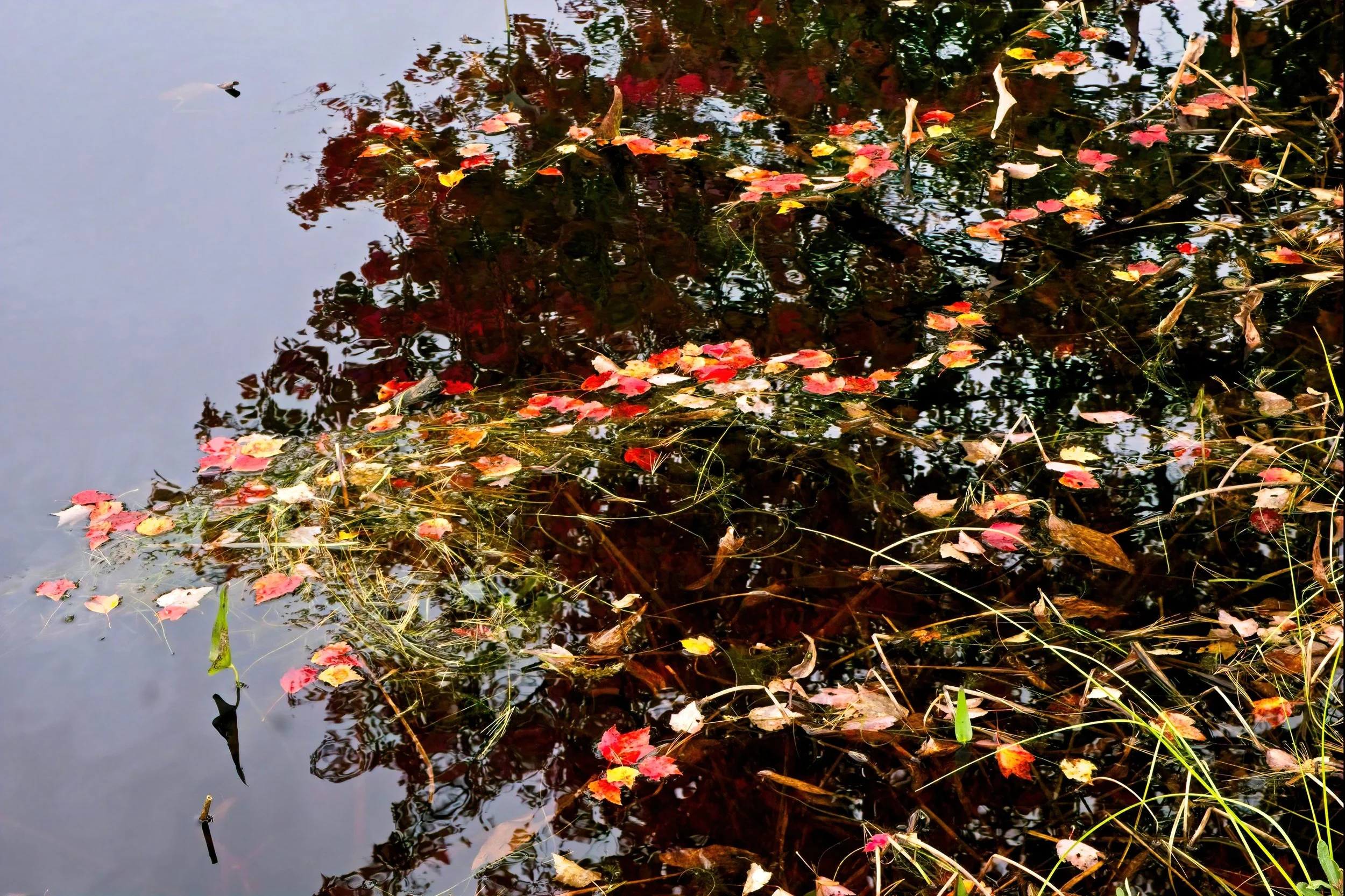 I thought this image was very interesting. The dark aspects are a reflection of a tree overhanging the river and the leaves are simply some that fell into the river and ended up over the shadows. So the colorful leaves float on the surface and the dark ones just are on the surface but seem deeper. Simple but neat.