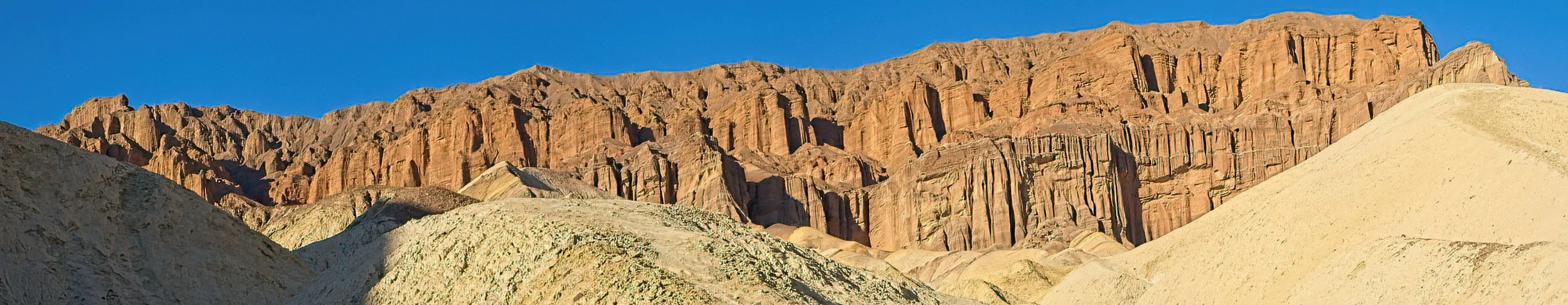 Hiking on the Golden Canyon trail in Death Valley National Park leads to a fork in the trail where you can go to the right and continue up to a plateau and it is the way I hiked one time when I was here before, or to the left. I chose the left route because I wanted to see “the Red Cathedral’ and we were not planning to hike the whole length of the trail up the to highway. This way the hike was just a three mile out and back. The Red Cathedral wall is impressive.And with the late afternoon sun the red was vivid. Great hike, hot even in April. This shot is a panorama with five photos merged into a single wide shot.