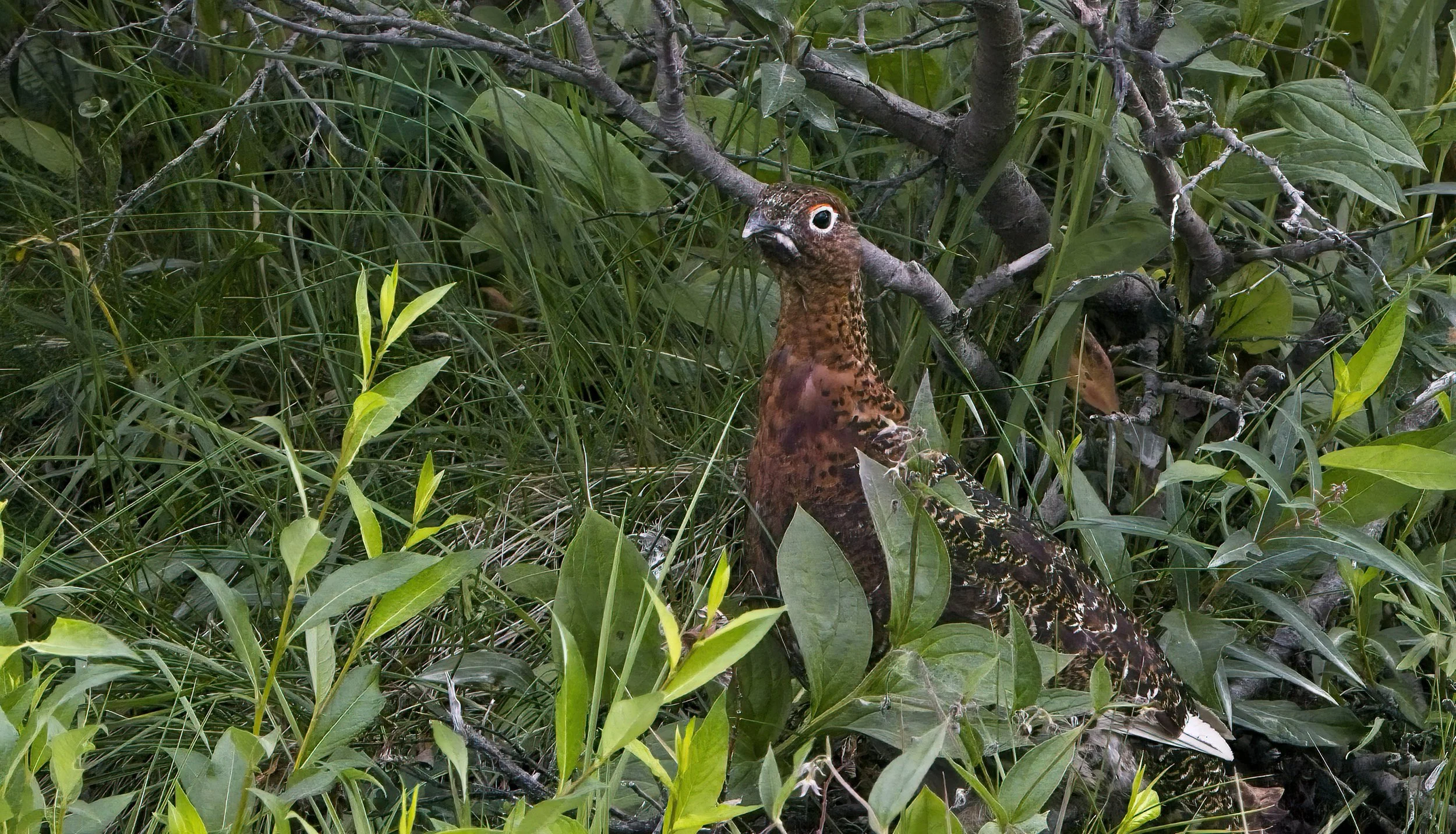 I am woking on some older photos that have been neglected or in some cases very poorly processed and I came across this Willow Ptarmigan from the Wonder Lake area of Denali. Most of the Ptamigans we saw were on the road or in the open tundra, but this guy was a bit shy. I really like the startled look the eye ring gives to this most colorful bird.