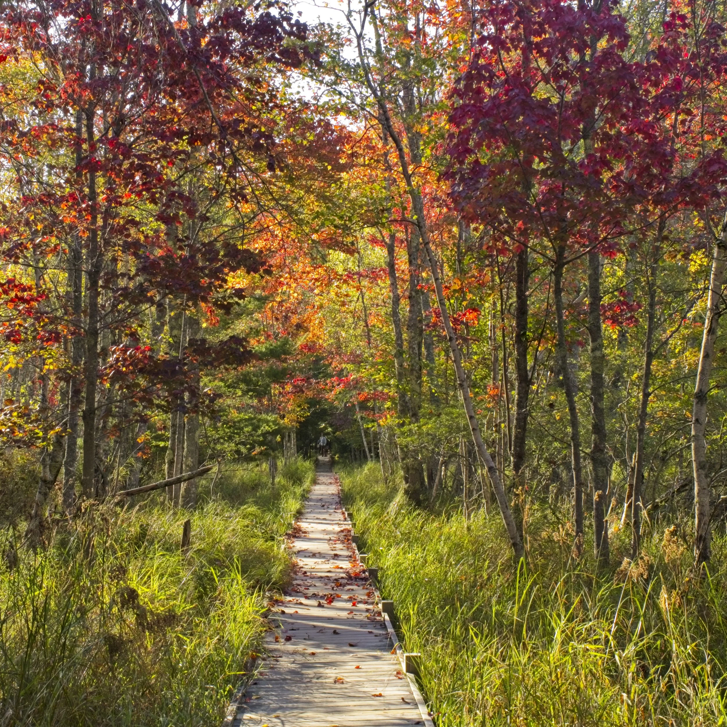 The is a portion of the Jessup Path in Acadia National Park. It is a neat area of marsh and transition trees. The birches are dying because the larger hardwoods are growing and blocking out the sun. This is natural. The area was burnt in a significant fire years ago and the birches grew quickly and now that the hardwoods have reached a more mature size the birches are losing out to them. The result for now is a neat landscape of white trunks and - in the fall - of a colorful canopy. Here the boardwalk is nearly a mile long and pretty straight. You can see, maybe, a group of people approaching deep in the trees on the boardwalk.