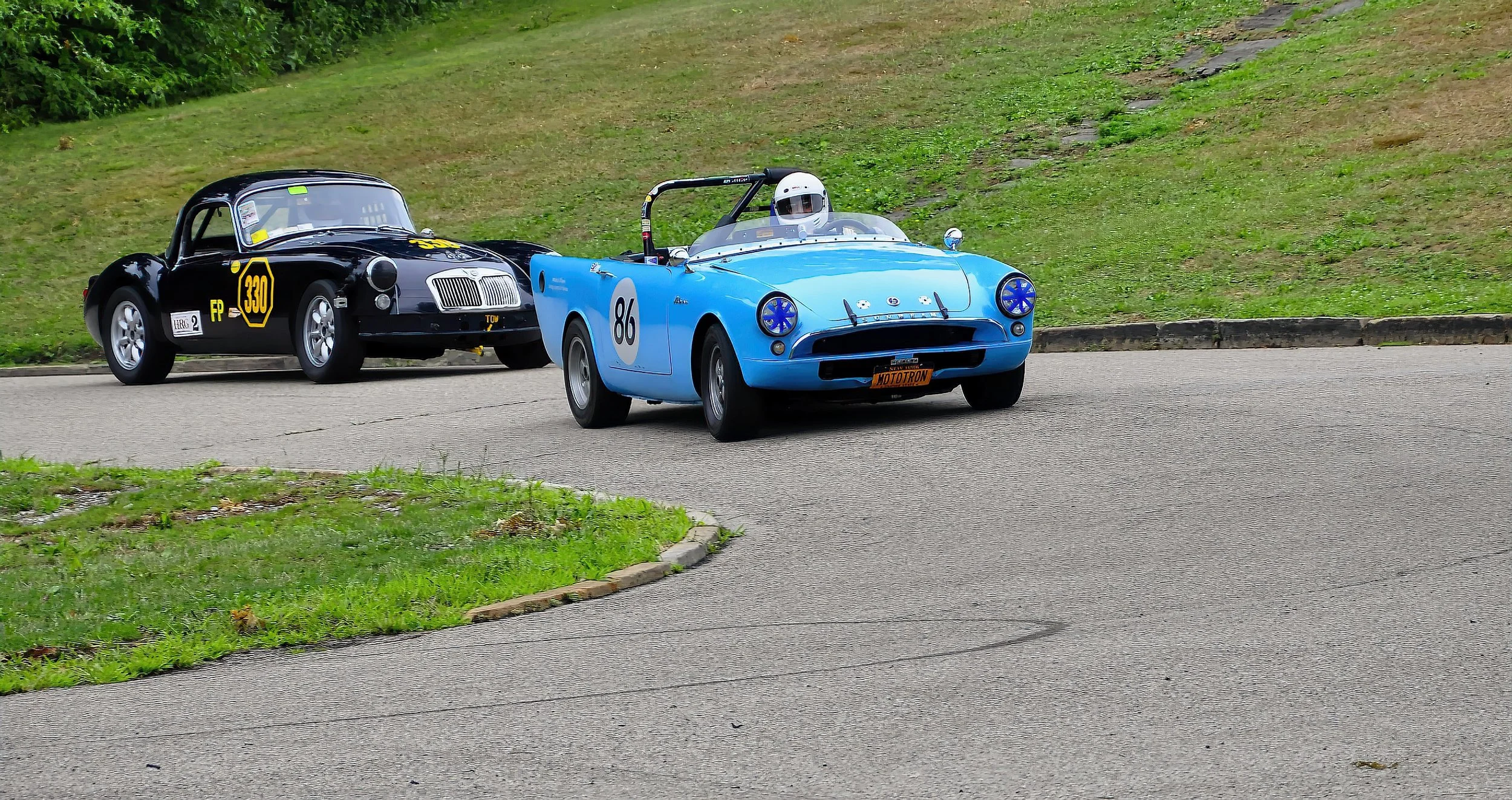 A Sunbeam Alpine leads an MG-A into a turn on the Schenley circuit for the 2012 Pittsburgh Vintage Gran Prix. Schenley Park is an urban park in Pittsburgh’s Oakland area near the Pitt and it is a fabulous place to watch this form of racing. Excellent spectator areas, staging and pit areas you can walk through, lots of parking and three days of racing plus a great car show. And lots of food venders.