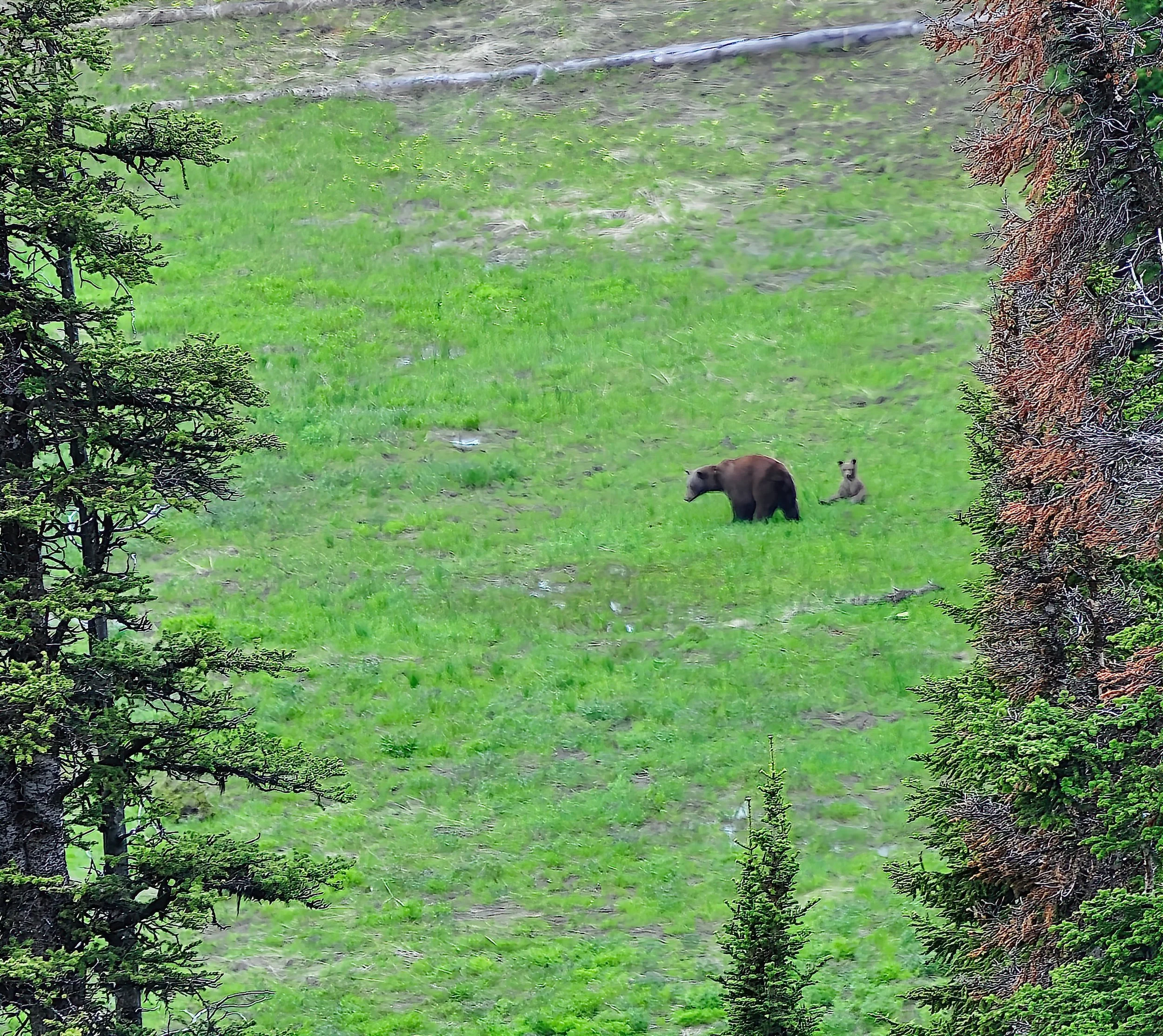 on this photo and I still love it. This is the first grizzly I have ever seen in the wild. We were at Yellowstone and she emerged from the tree line with her cub. They were in sight for about 5 minutes. By the time I got out the tripod, changed the lens and got it set up, there was very little time. The bears were a looooong way away. - across a valley. I was still very new to photography with any actual intentions and was with my new camera. I rushed everything and got about 12 shots of the bear. Only this one had the cub sitting and both faces visible. And my exposure was off and my focus was really off, see how nicely sharp the tree on the right is:) But still the first grizzly, a pose like a teddy bear for the cub, a photo to remember it all and a desire to not mess that kind of opportunity again. I would do, of course, but maybe fewer times. One reason I really like this medium the experience of that moment comes flooding back even when the photo is not superior.