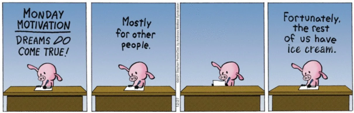 So this is a cartoon from S.Pastis who writes Pearls Before Swine. Originally it had on the last panel, “Cheese” which is a horrible ending for the strip. I thought ICE CREAM is the perfect conclusion. So, Dennis Mook took the panel to, I guess Photoshop, and put in the better line. And it is posted here for all to enjoy. Thanks, D.