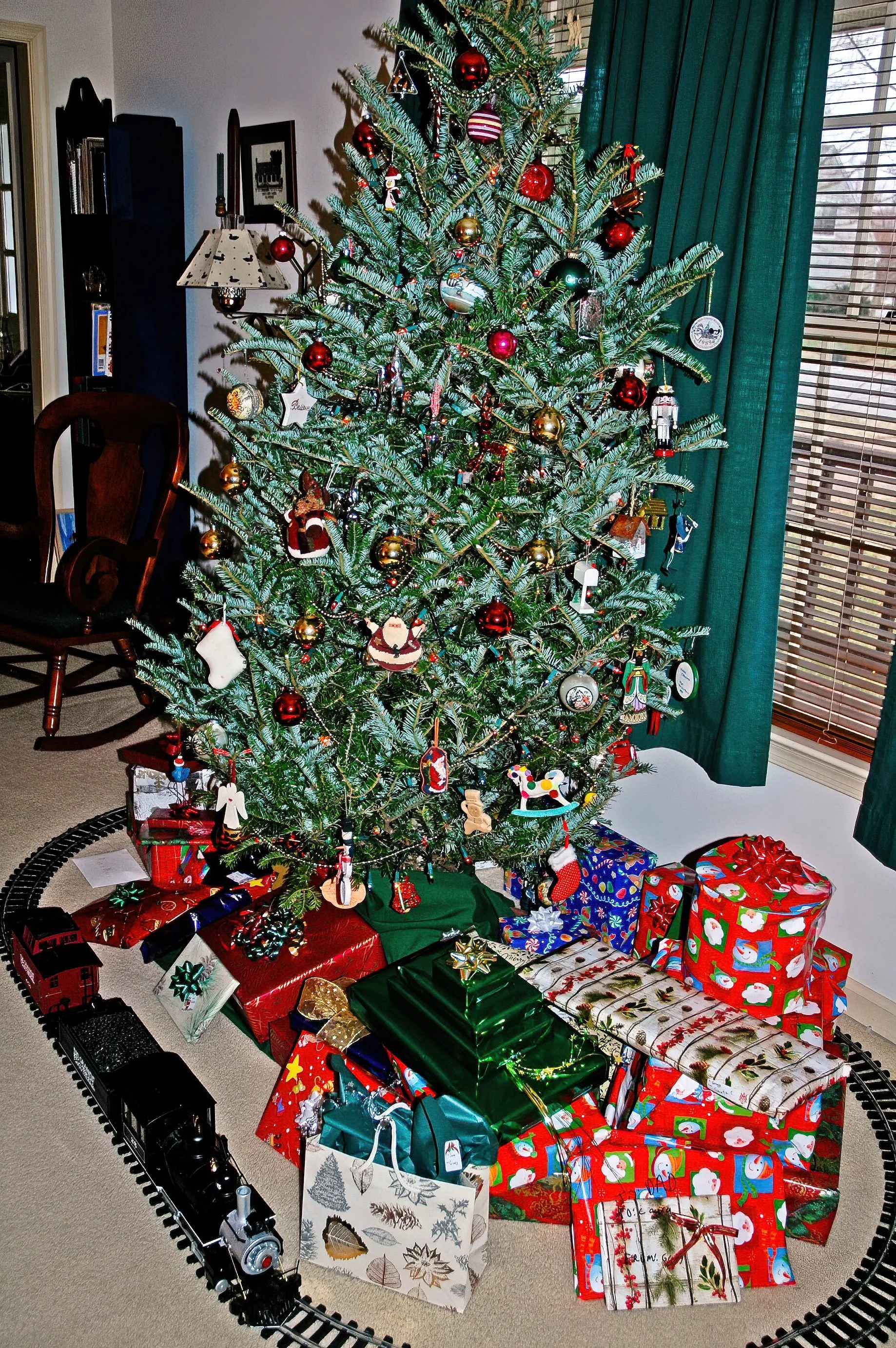 Trains. This photo is from 2004, one of mine that I recently was able to access again after a long time. It is not a great shot but it does have the “G” gauge train set that our friend, Gregg Lagerberg, gave to our boys when they were little. Neither of them was particularly enamored of the train so in 2004 as our grandson, Kellen, was coming to the house and he would be turning two, I set it up again. He was not charmed. Too loud. Eventually I gave the set to a friend whose two boys appeared to like trains. Growing up setting up the train was a big deal. We had a Lionel “O” 27 gauge then later changed to an “HO” scale that we would set up on a 4 x 8 platform with painted streets and houses that lite up. The tree was always precariously perched on a stand in the middle and the sheet of plywood would sag ever so slightly under the weight giving the train a bit of an up and down. As a teen I bought an “N” gauge set and even built a couple of small layouts, one under our tree the first year we were married. I still have that train - maybe next year it will be under the tree.