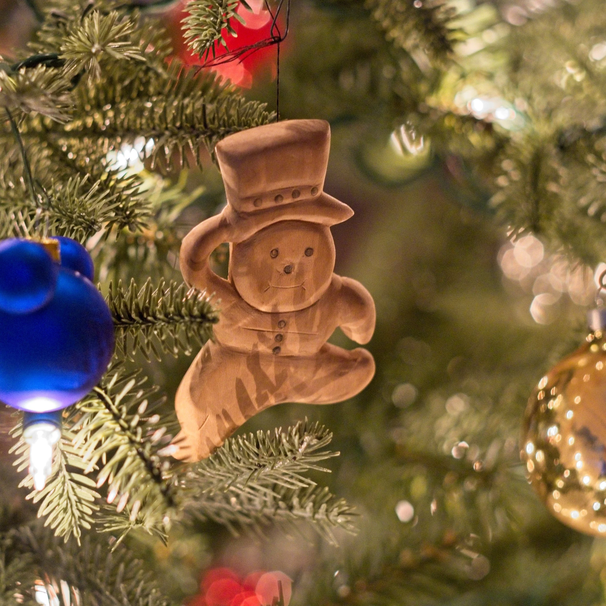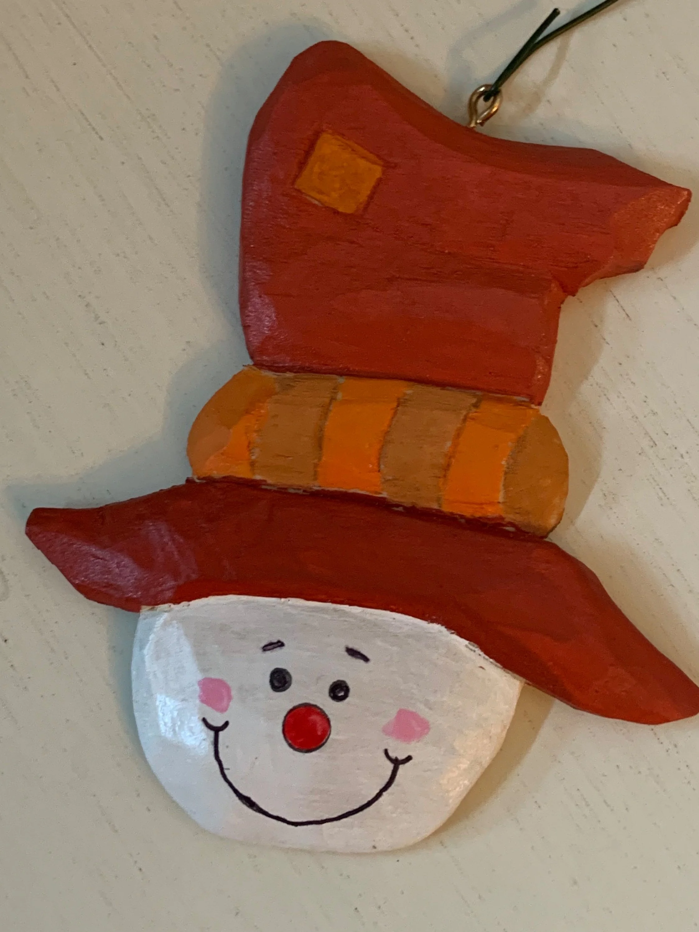 A master! I think I wrote about this before but there is a difference this year. My Aunt Carrie, who loved to travel, brought two hand carved ornaments back from a trip in the mid 1950’s to Nova Scotia. One for me and one for my brother. They were carved by a now well known Canadian carver, Andre Gault. They have been on our tree each year since. I think they are carved from maple. So, this year as I come up on nearly two years of learning to carve I thought I would “duplicate” my snowman for it is a rather uncomplicated piece. Wow, simple is deceptively hard. I did not expect too much of my work and I was right! His is all subtle, smooth curves and converging sections. My work is halting, semi-round and smushed together. Still on the tree it goes. Next year will be better.