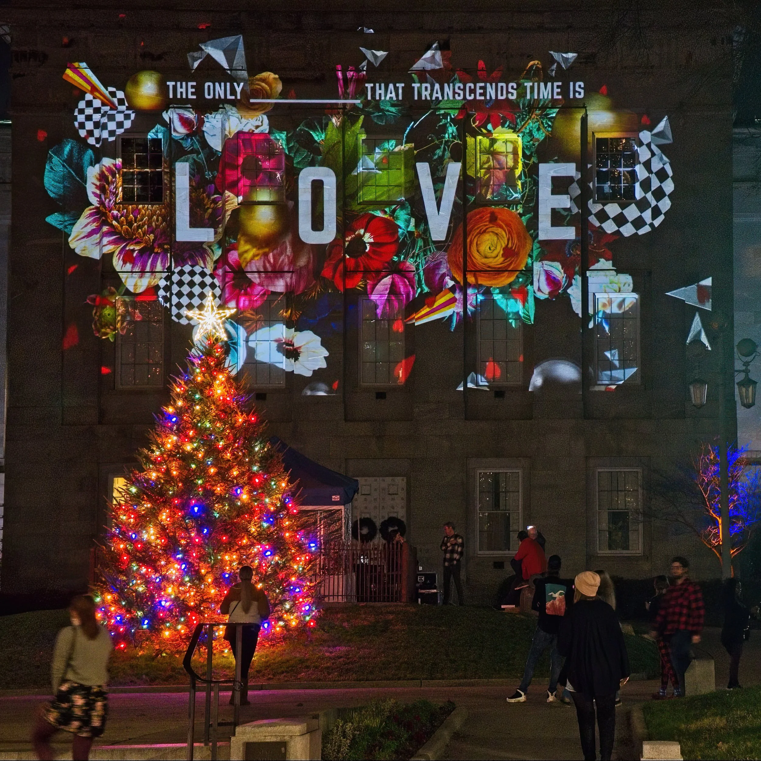 At the North Carolina State Capital you can find this bright Christmas Tree and they have added projection behind it on the building. It made for a colorful display and brought out a few people on a rather warm December night.