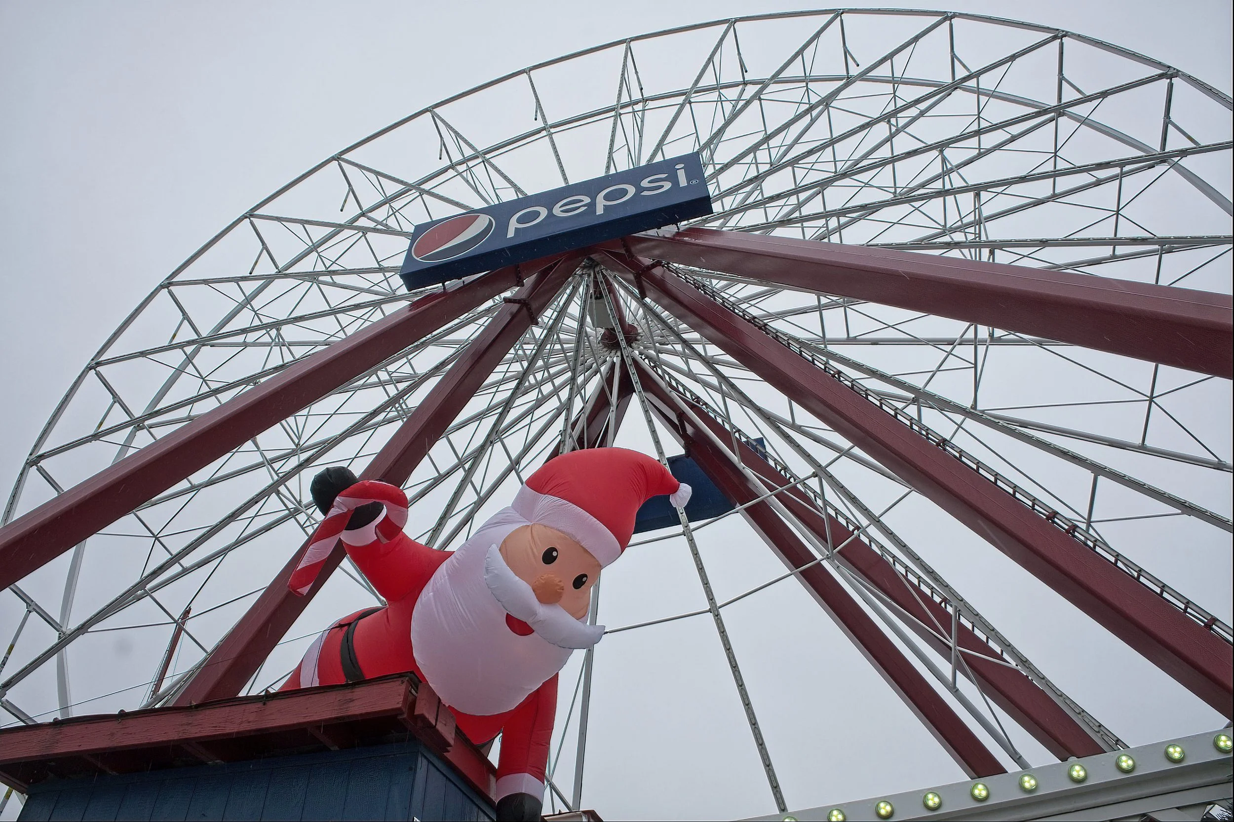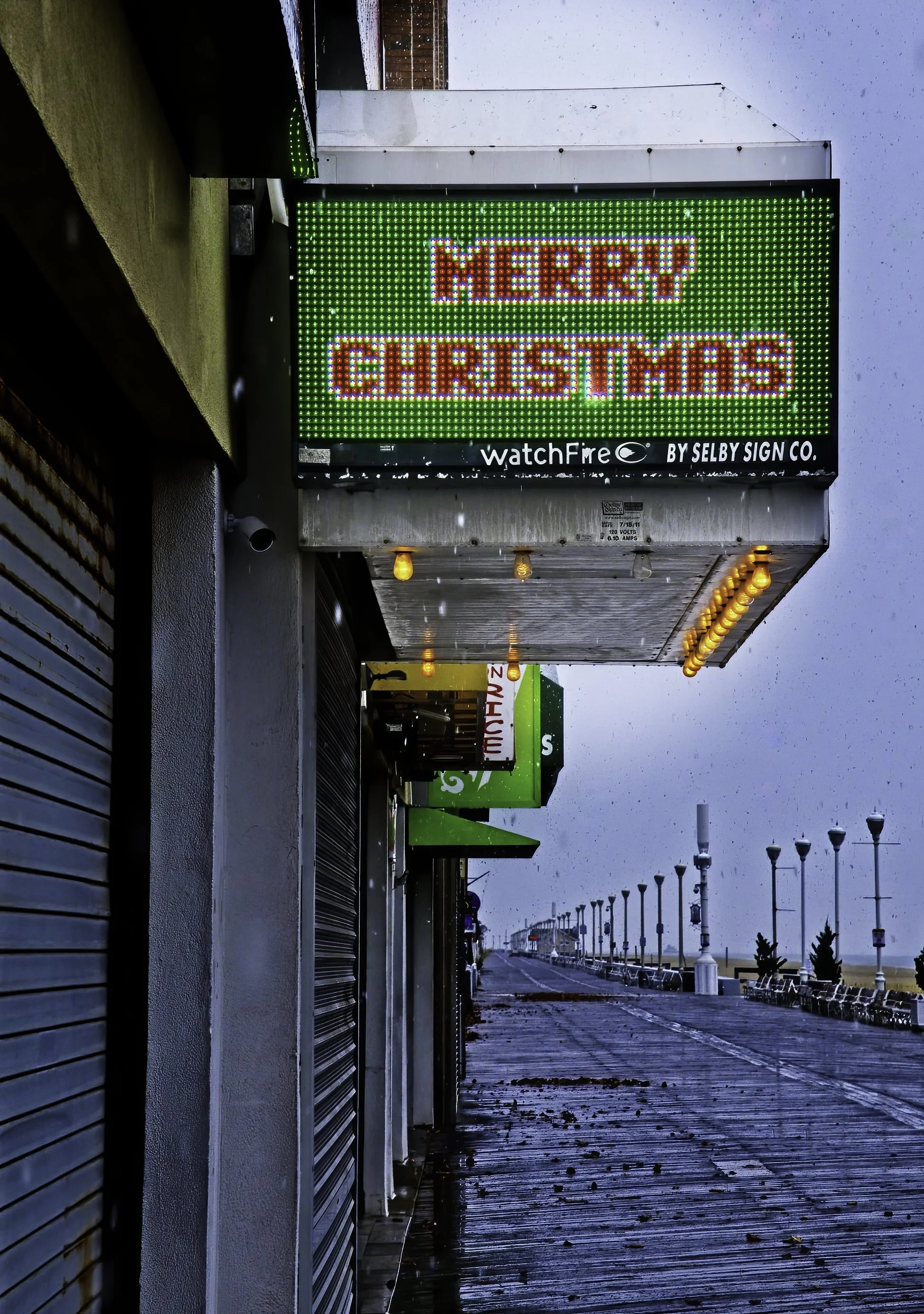 This scene is from a short trip to Ocean City, Maryland on a cold, sleety and occasionally snowy afternoon. There were few people around. Most of them were apparently sane. I was taking pictures along with my friend Dennis, however, he does not improve the “it really is not too bad to go shoot photographs today,” factor. There were a few nods to the upcoming holiday. This fallen Santa against the deserted and bare Ferris wheel were indicative of the effort to make this a merry celebration. Still, it really was not too bad out there: