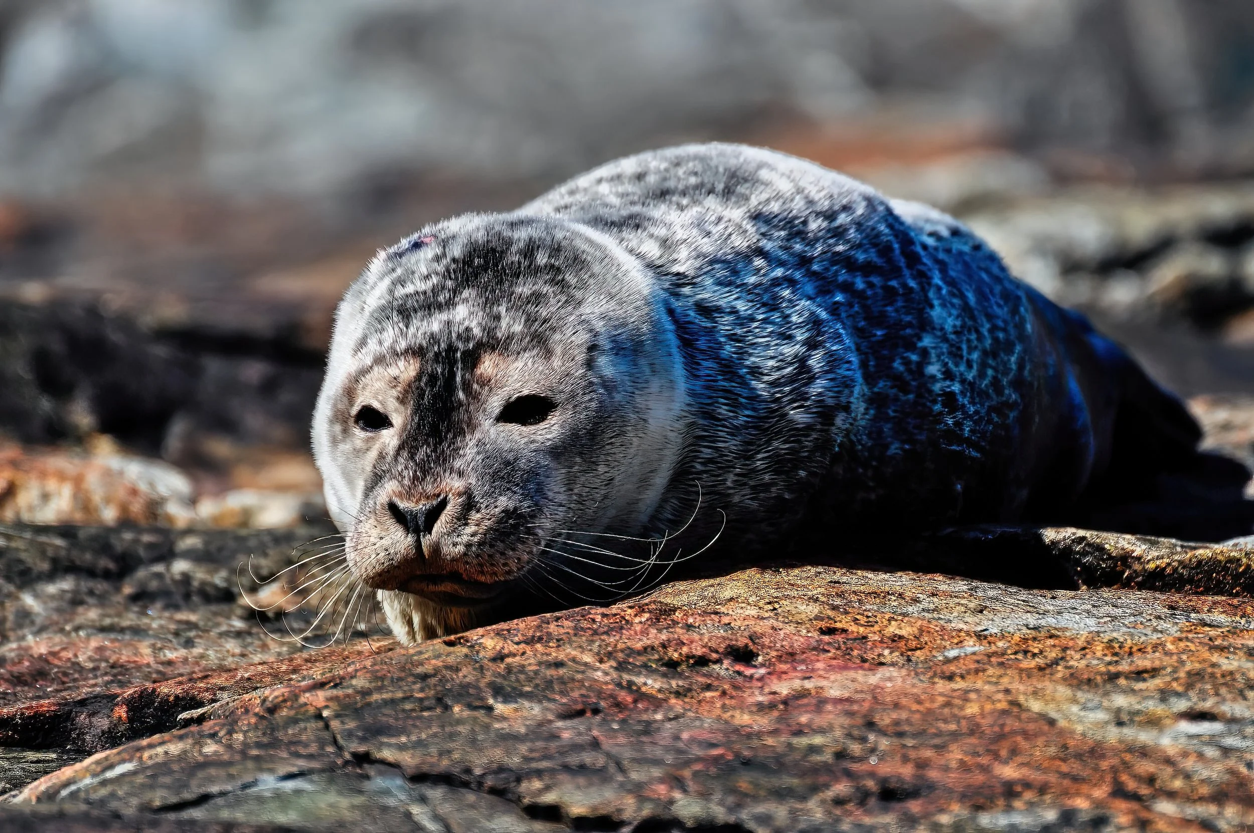 This young seal was attacked by “something” and had a head wound. We alerted a ranger but I have no idea if they were able to do anything for the seal. Along the rocks in Otter Cliffs at Acadia National Park.
