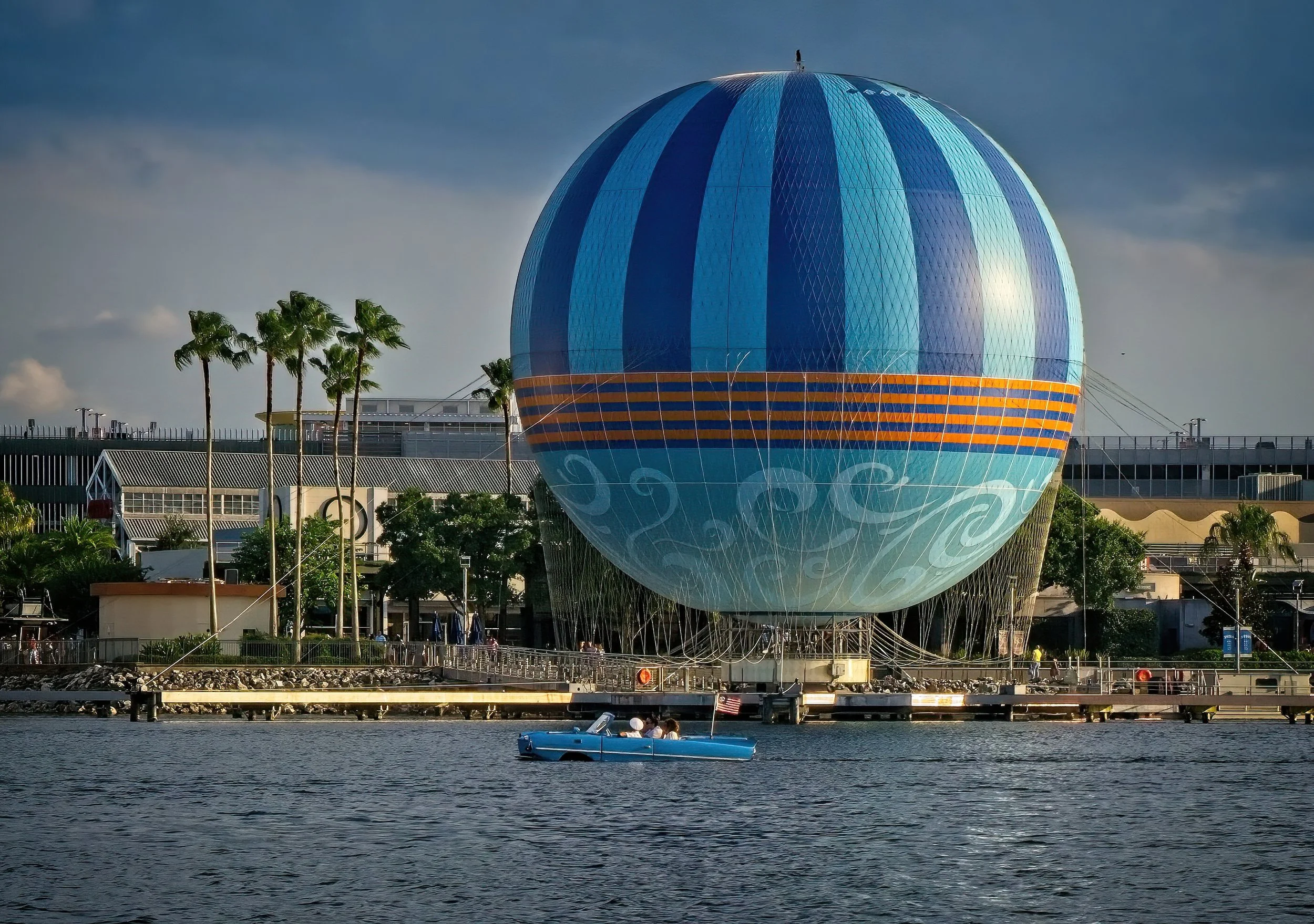 A mid-fifties Amphicar plies the water in front of the hot air balloon at Disney Springs.