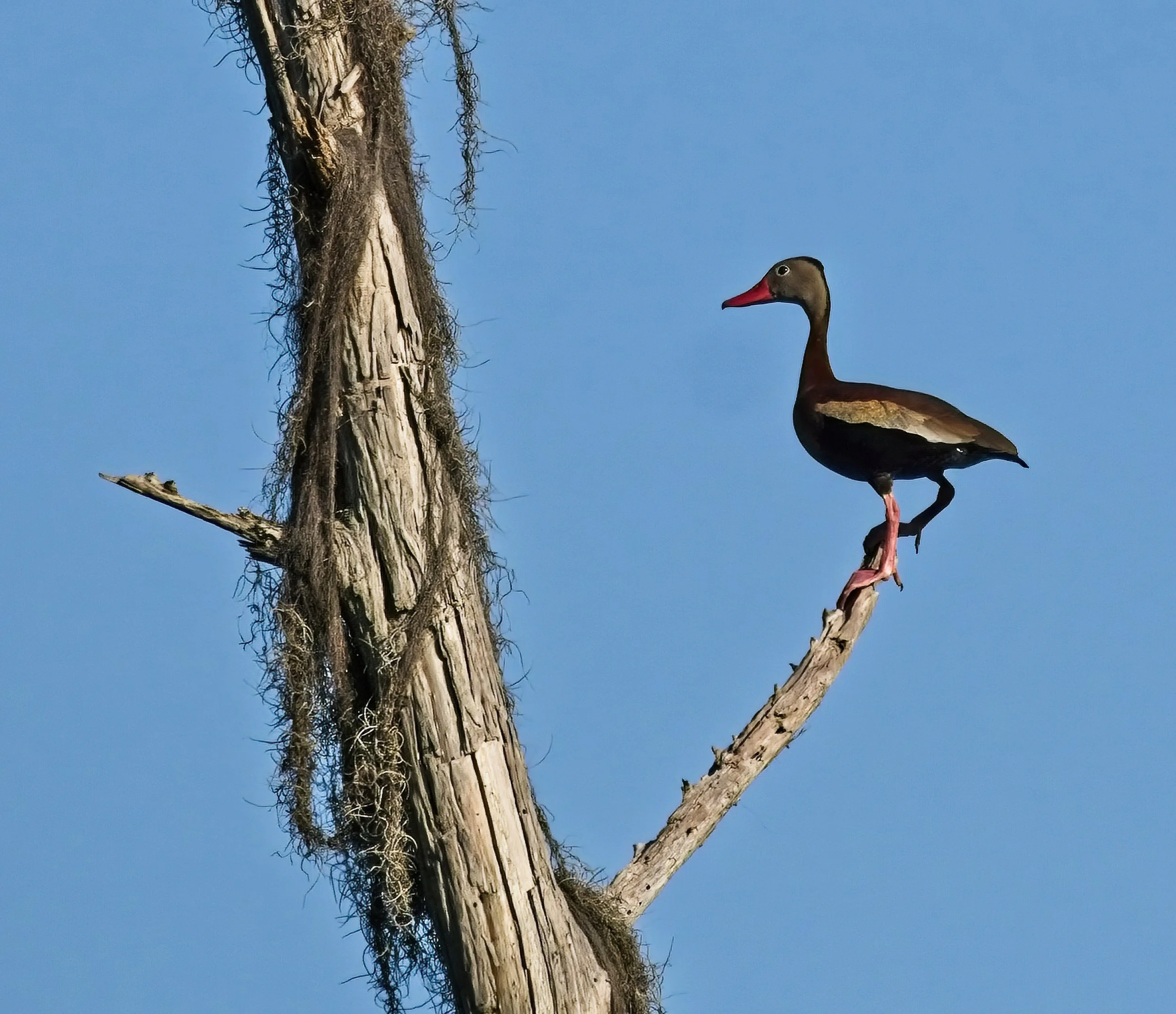 Posing for me, just for me, on a tree about 100 yards from our campsite was a Black-bellied Whistling-duck. More importantly, he posed while I got my camera out and changed to my long lens. I got off six shots and then he flew. This bird is characterized by the red bill, white eye ring and pink legs. The upper body is a rust color, the lower is solid black, (hence the name.) This is a new bird for me, number 410. Next up, maybe a Fulvous Whistling Duck? No could not be that lucky but they do live in the same environment. Maybe?
