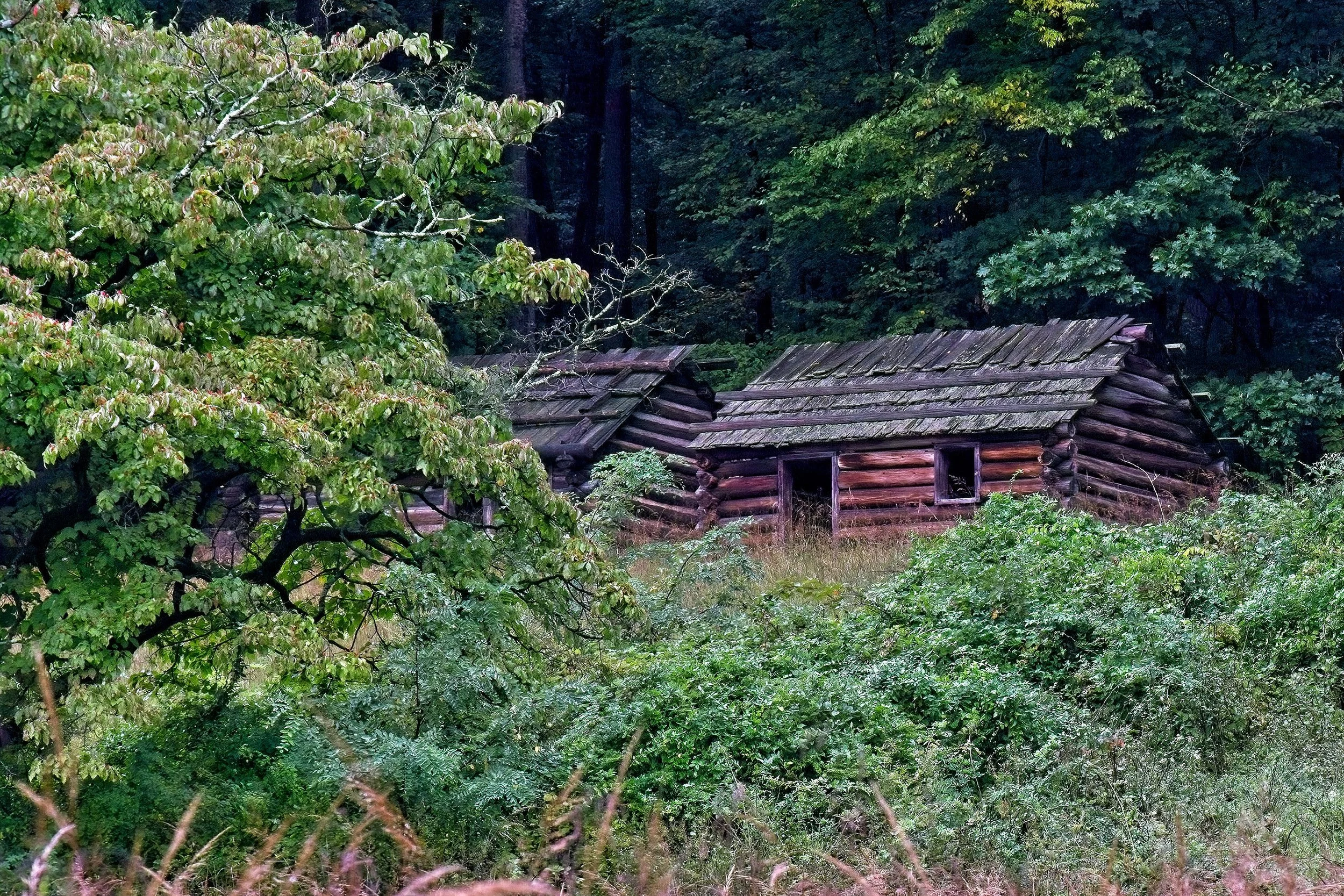 This cabin is in Morristown, NJ and is a replica of the ones constructed by the Continental Army in the winter of 1779/80. The army camped here earlier over the 76/77 winter and in Valley Forge, the most well known of the camps, in 77/78. The winter of 1779/80 was actually worse than the year before at Valley Forge. There were 20 major snowfalls including on over 4 days that left 4 feet of snow. There were about 1000 of these cabins built and each one provided living space to 12 soldiers. Although they were designed to hold 12,000 men, only about 8,000 were here near the end of the winter with death and desertions reducing the numbers. They army used 2000 acres of woodlands to build the needed shelters and heat them. So, while the site is wooded today it would have been only stumps in 1779.