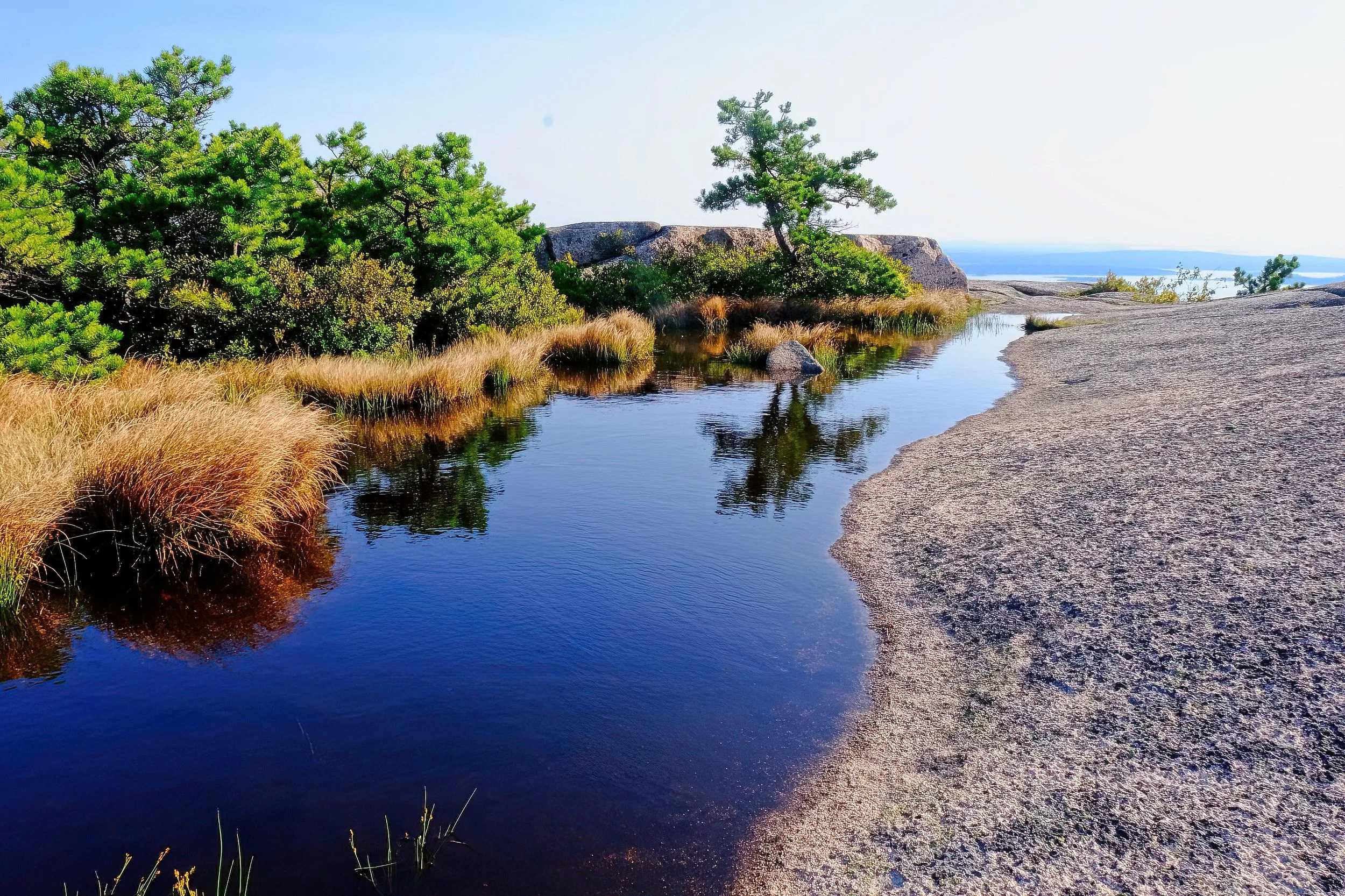 If you climb the Precipice Trail at Acadia National Park, you can find this small emerging ecosystem. Over the years the rock has eroded until it holds a substantial amount of water, maybe 6 or 8 inches deep and around it you will find grasses, small trees and bushes. Each time I have been here it seems to be a tiny bit larger. All on an otherwise bare rock face.