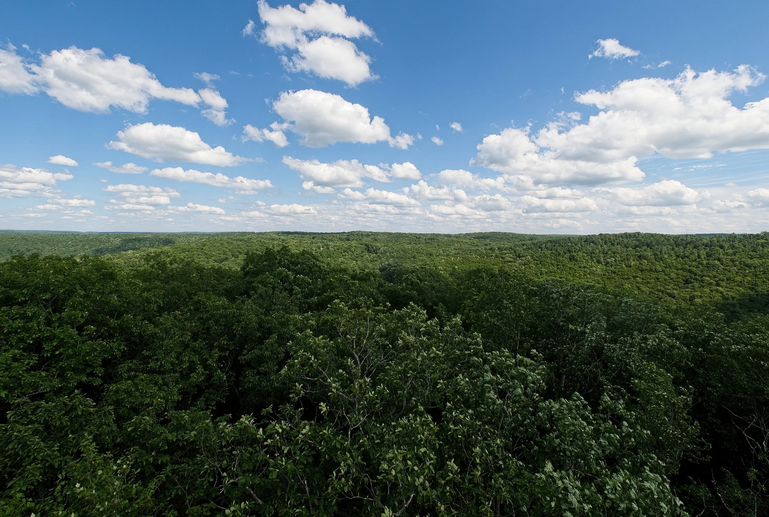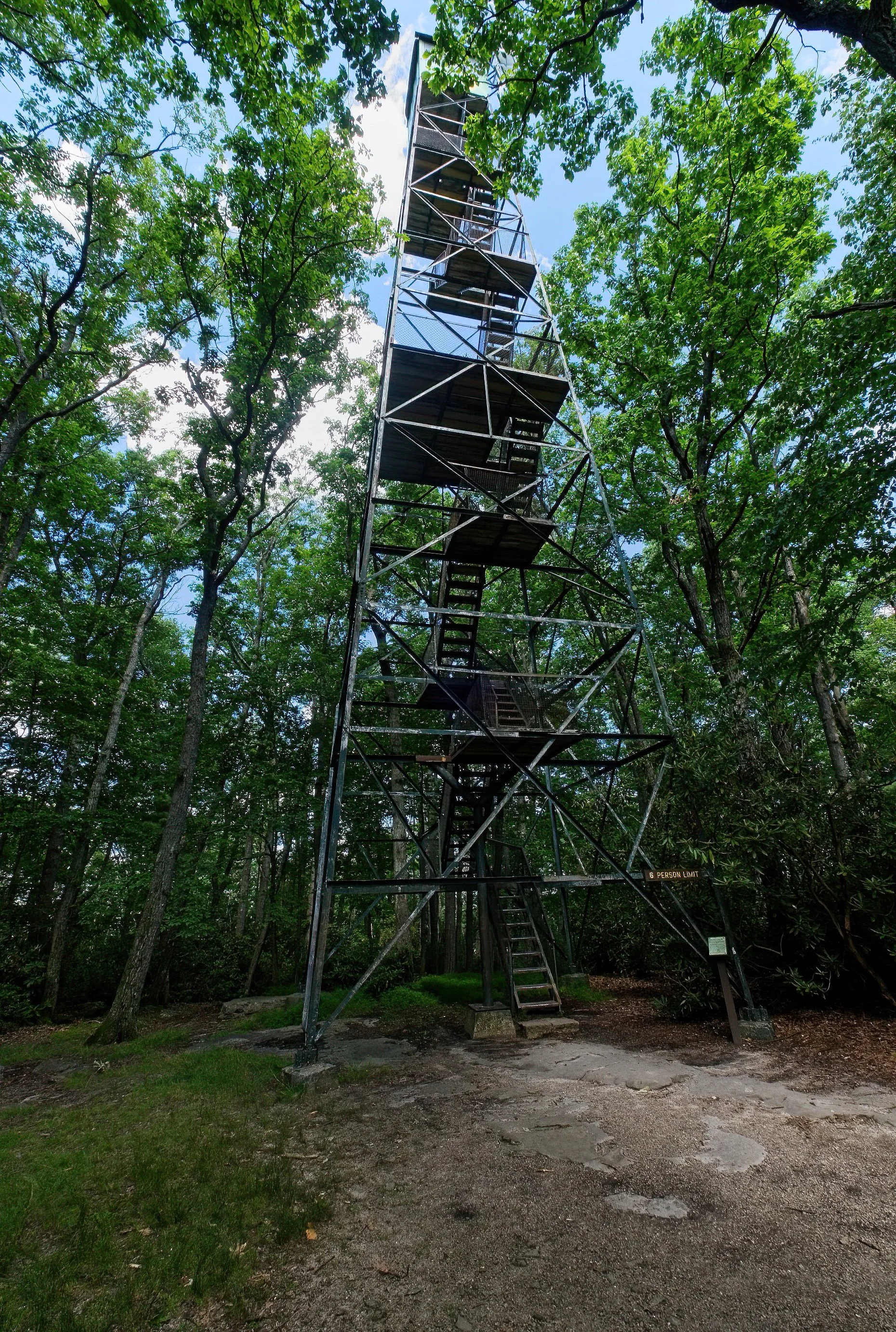 This is the shakiest and most uncomfortable fire tower I have ever climbed. It is 89 feet hight and built in 1929. So it has been upright a long time. The first two sets of steps were rebuilt with metal the rest were thick wooden boards and not all of them were even. The railings were added on the lower portion and they were about waist high but the top three platforms were only a bit over my knee. The very top was two and one half boards wide. The metal seemed very thin and not at all sturdy. Nonetheless, it is still enduring nearly 100 years in and they still let you climb, which is very neat. The view was supposed to be 10 miles and it might have been but only the tops of trees.