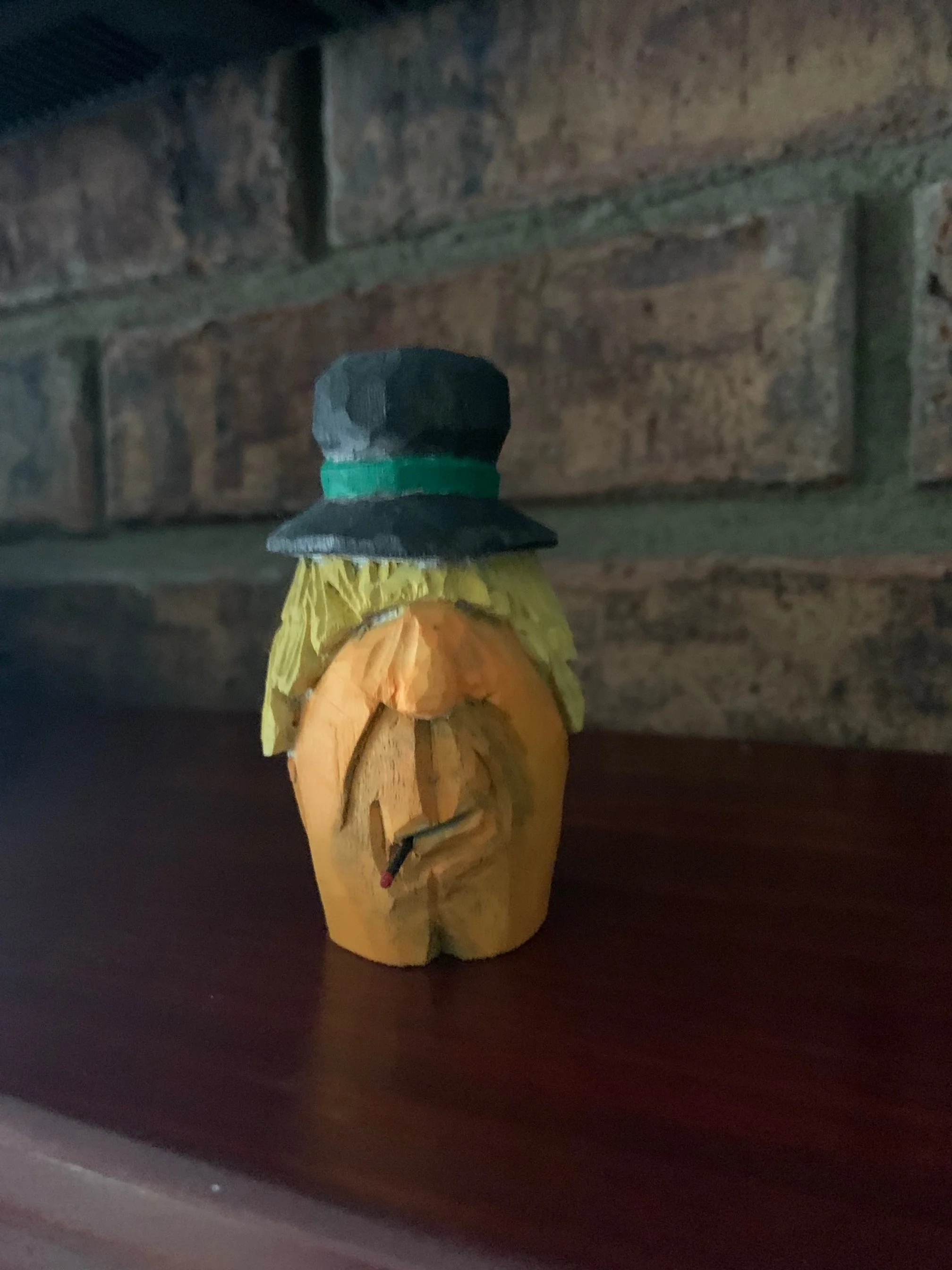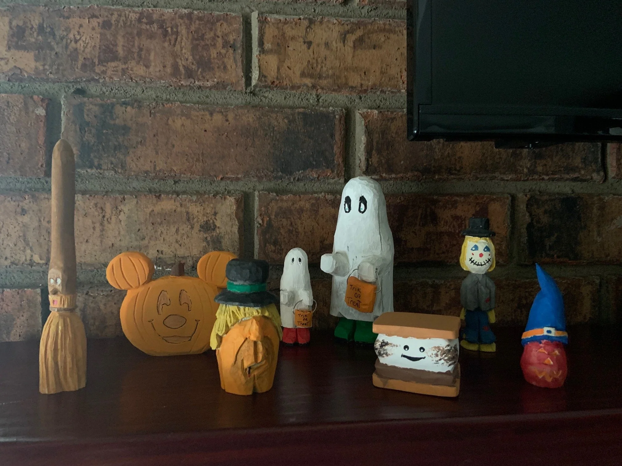 Happy Halloween. This is my latest carving, a pumpkin head hobo. The last photo is the whole menagerie of seasonal carvings.