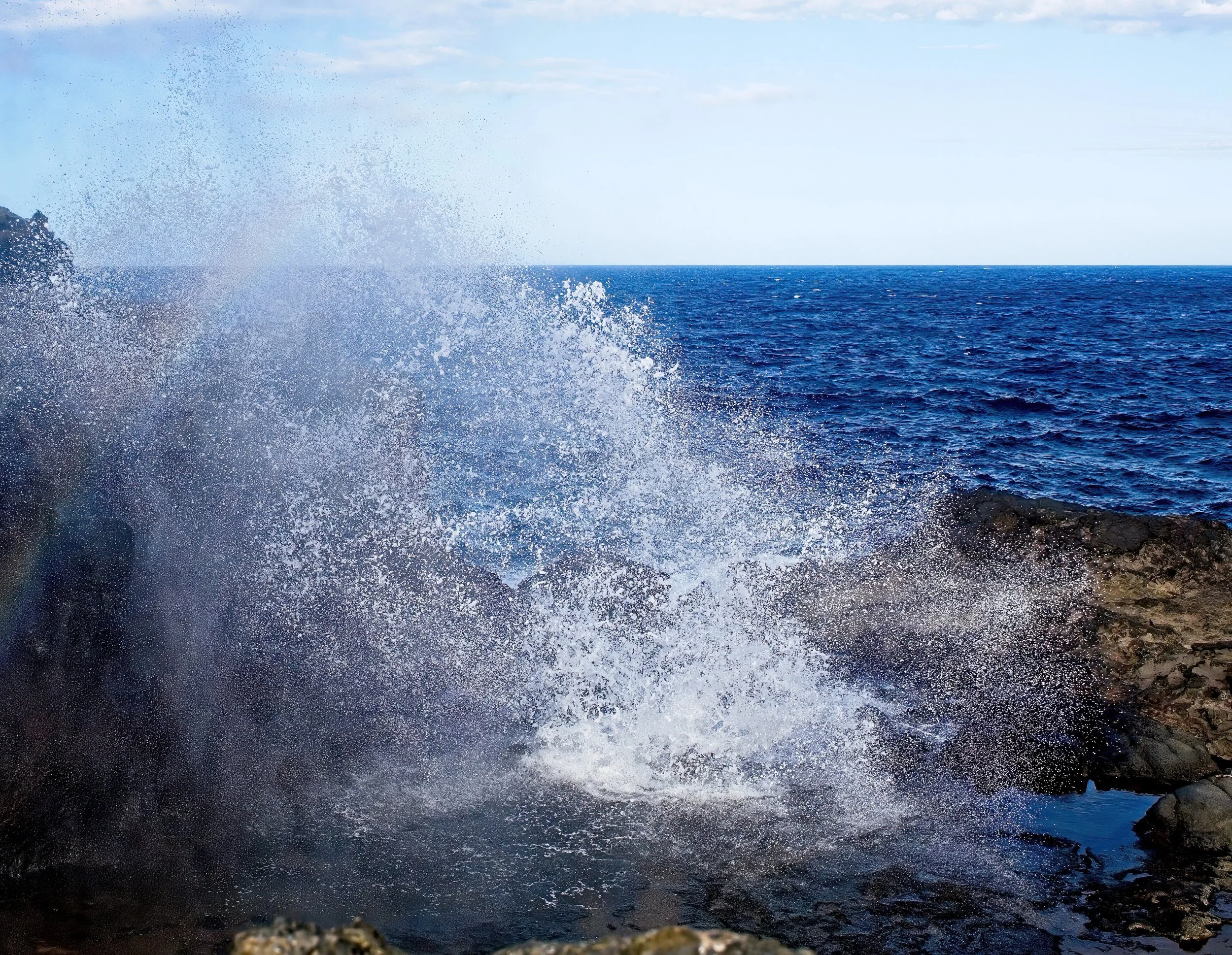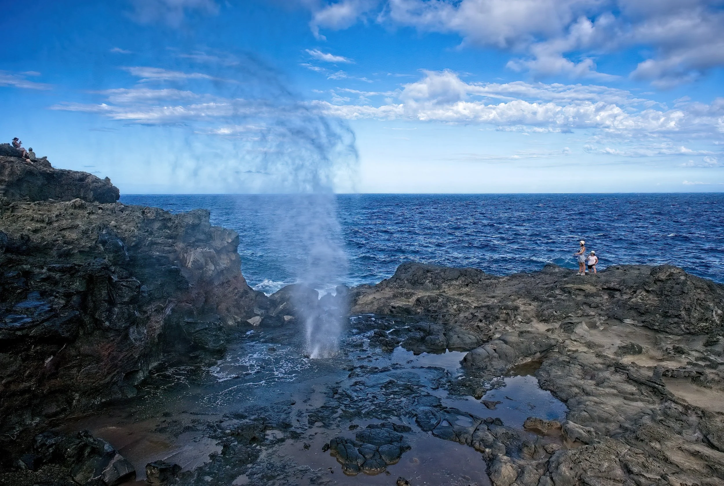 This is a blow hole located on the very Northwest coast of Maui. We watched as several eruptions soared dwarfing the people who ventured near the outlet. The wind was strong and even yards away the spray would reach you.
