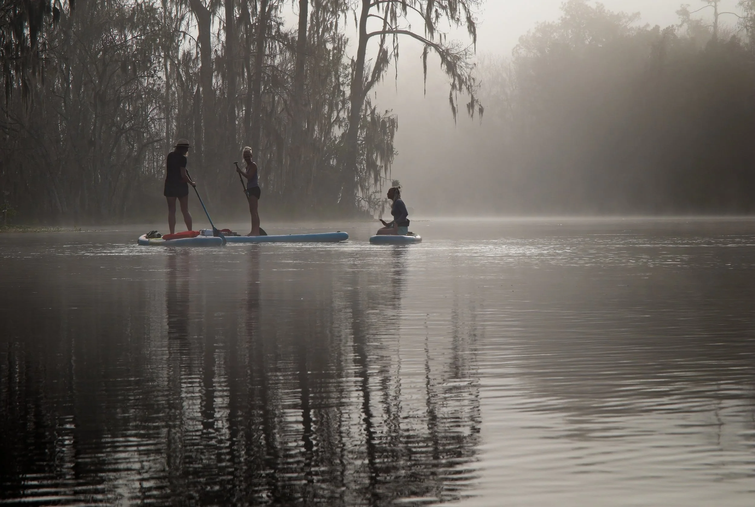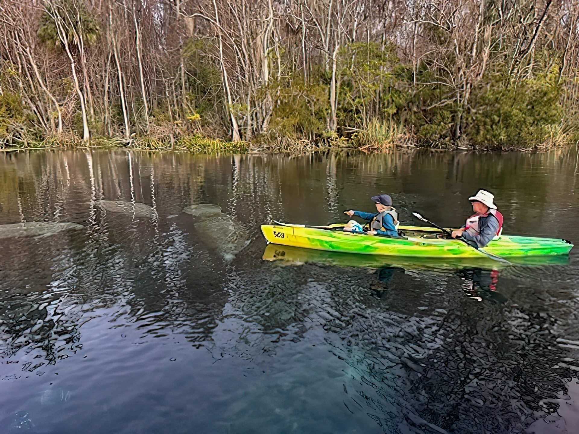 Cindy and I were on the Silver River in a kayak looking for manatee. After an hour with no success, in the middle of the river, three beautiful women appeared on flat sailing devices standing on the water and beckoned us to follow them. They directed us to some manatee, herded them so we could get better views, and then took our picture with the gentle water beasts. Before we could barely thank them, they drifted off into the mist of the stream, and we never saw them again.