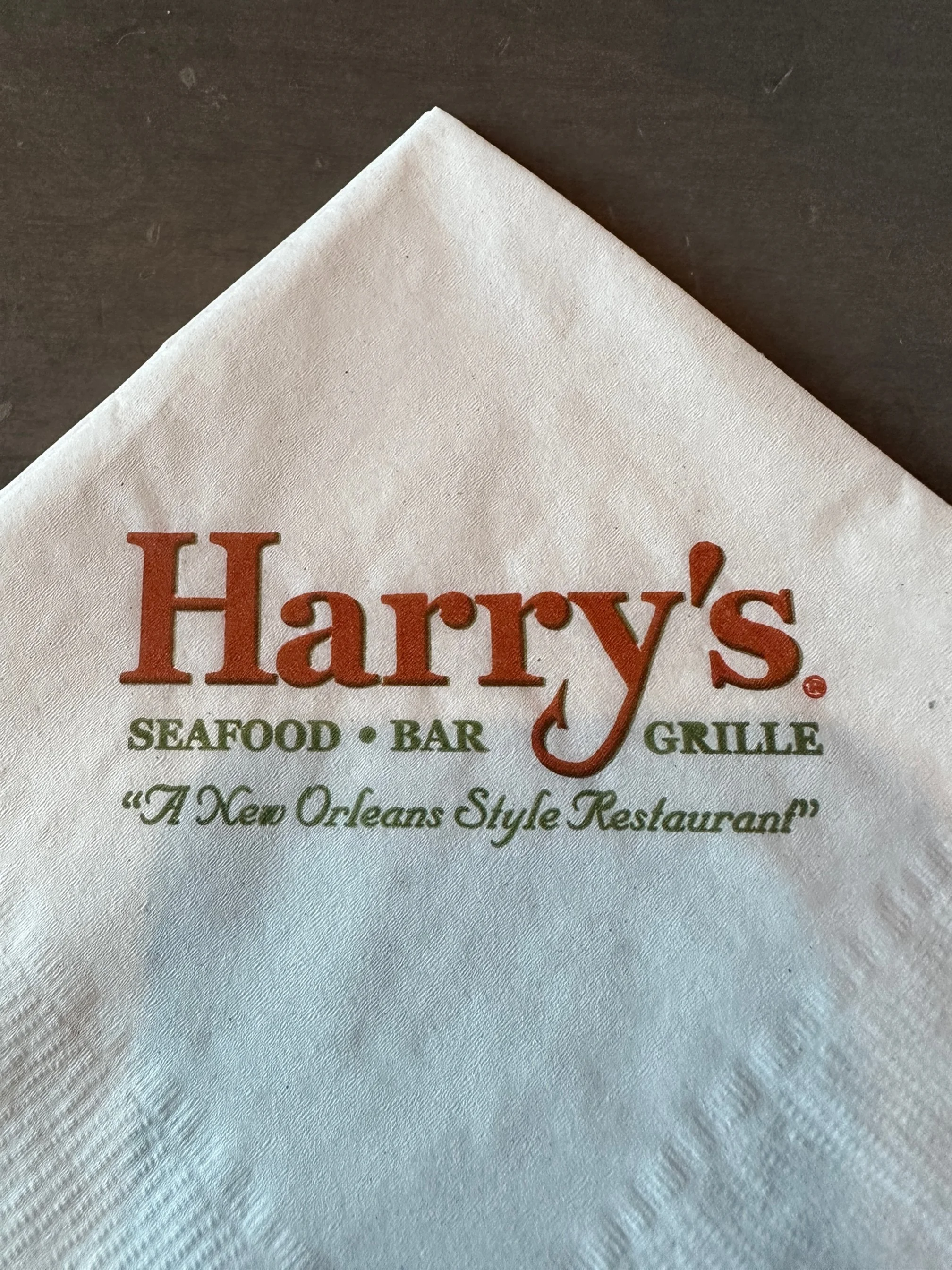 Harry’s - fair prices, great food, attentive service, nice ambiance, understated New Orleans atmosphere, happy diners, extensive drinks menu and desserts that I can only imagine because we did not get any! Ridiculous decision. I need more desserts not fewer desserts if I am to achieve my Great British Baking Show judgeship. Help me out here and send dessert coupons to me or money or leftover desserts. (ED NOTE, please don’t he needs to watch his weight.)