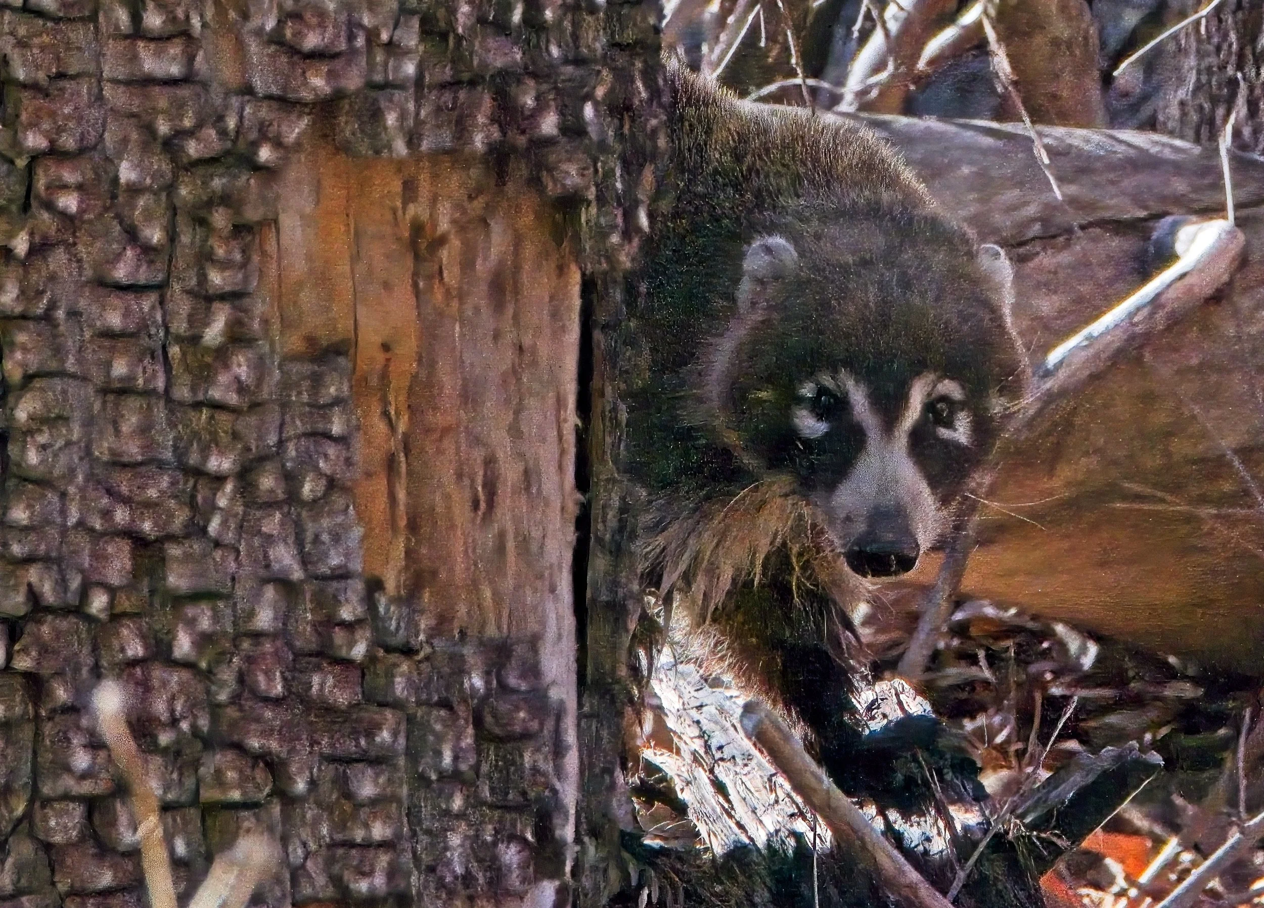 Hiking along a dry river bed in the Chiricahua National Monument in Southeast Arizona Cindy spied a Coatimundi. I got one photo as he peered at us from behind a tree and a couple more as he scampered away. I had never seen one before. Native to South and Central American they have edged into parts of NM & Az mountains. They are interesting creatures and are named for their large noses. Note the super long tail they use for balance as they spend a lot of time in trees. The males are loners the female and their young travel in a group. The US ones are specifically White Nosed Coatimundi. You can read a bit more at https://www.treehugger.com/coatimundi-facts-5089327
